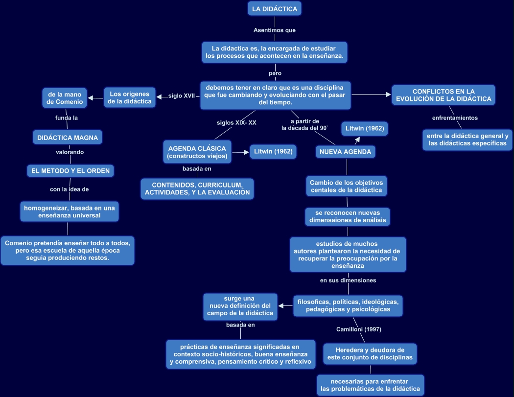 Este Cmap, tiene información relacionada con: didáctica, Heredera y deudora de este conjunto de disciplinas ???? necesarias para enfrentar las problemáticas de la didáctica, debemos tener en claro que es una disciplina que fue cambiando y evoluciando con el pasar del tiempo. a partir de la década del 90` NUEVA AGENDA, filosoficas, políticas, ideológicas, pedagógicas y psicológicas Camilloni (1997) Heredera y deudora de este conjunto de disciplinas, LA DIDÁCTICA Asentimos que La didactica es, la encargada de estudiar los procesos que acontecen en la enseñanza., homogeneizar, basada en una enseñanza universal ???? Comenio pretendía enseñar todo a todos, pero esa escuela de aquella época seguia produciendo restos., CONFLICTOS EN LA EVOLUCIÓN DE LA DIDÁCTICA enfrentamientos entre la didáctica general y las didácticas específicas, Cambio de los objetivos centales de la didáctica ???? se reconocen nuevas dimensaiones de análisis, de la mano de Comenio funda la DIDÁCTICA MAGNA, AGENDA CLÁSICA (constructos viejos) basada en CONTENIDOS, CURRICULUM, ACTIVIDADES, Y LA EVALUACIÓN, NUEVA AGENDA ???? Litwin (1962), estudios de muchos autores plantearon la necesidad de recuperar la preocupación por la enseñanza en sus dimensiones filosoficas, políticas, ideológicas, pedagógicas y psicológicas, EL METODO Y EL ORDEN con la idea de homogeneizar, basada en una enseñanza universal, filosoficas, políticas, ideológicas, pedagógicas y psicológicas ???? surge una nueva definición del campo de la didáctica, La didactica es, la encargada de estudiar los procesos que acontecen en la enseñanza. pero debemos tener en claro que es una disciplina que fue cambiando y evoluciando con el pasar del tiempo., debemos tener en claro que es una disciplina que fue cambiando y evoluciando con el pasar del tiempo. siglos XIX- XX AGENDA CLÁSICA (constructos viejos), AGENDA CLÁSICA (constructos viejos) ???? Litwin (1962), debemos tener en claro que es una disciplina que fue cambiando y evoluciando con el pasar del tiempo. siglo XVII Los origenes de la didáctica, surge una nueva definición del campo de la didáctica basada en prácticas de enseñanza significadas en contexto socio-históricos, buena enseñanza y comprensiva, pensamiento crítico y reflexivo, NUEVA AGENDA ???? Cambio de los objetivos centales de la didáctica, Los origenes de la didáctica ???? de la mano de Comenio
