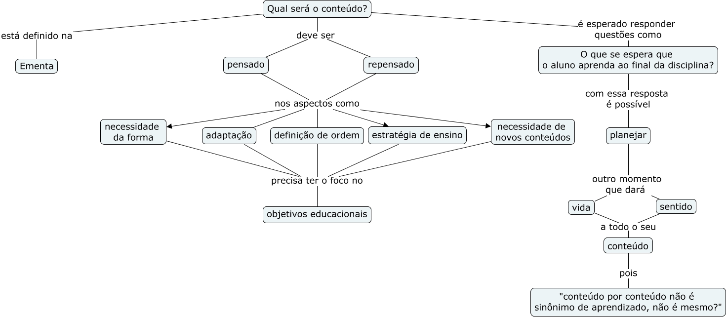 Esse mapa conceitual, produzido no IHMC CmapTools, tem a informação relacionada a: qualSeraOConteudo, planejar outro momento que dará vida, pensado nos aspectos como necessidade da forma, O que se espera que o aluno aprenda ao final da disciplina? com essa resposta é possível planejar, repensado nos aspectos como estratégia de ensino, definição de ordem precisa ter o foco no objetivos educacionais, repensado nos aspectos como necessidade de novos conteúdos, planejar outro momento que dará sentido, Qual será o conteúdo? é esperado responder questões como O que se espera que o aluno aprenda ao final da disciplina?, pensado nos aspectos como adaptação, pensado nos aspectos como necessidade de novos conteúdos, necessidade da forma precisa ter o foco no objetivos educacionais, repensado nos aspectos como necessidade da forma, Qual será o conteúdo? deve ser repensado, conteúdo pois "conteúdo por conteúdo não é sinônimo de aprendizado, não é mesmo?", Qual será o conteúdo? deve ser pensado, repensado nos aspectos como adaptação, estratégia de ensino precisa ter o foco no objetivos educacionais, adaptação precisa ter o foco no objetivos educacionais, repensado nos aspectos como definição de ordem, sentido a todo o seu conteúdo