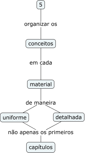 Esse mapa conceitual, produzido no IHMC CmapTools, tem a informação relacionada a: cinco, material de maneira detalhada, conceitos em cada material, 5 organizar os conceitos, detalhada não apenas os primeiros capítulos, uniforme não apenas os primeiros capítulos, material de maneira uniforme