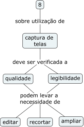 Esse mapa conceitual, produzido no IHMC CmapTools, tem a informação relacionada a: oito, captura de telas deve ser verificada a qualidade, qualidade podem levar a necessidade de ampliar, legibilidade podem levar a necessidade de editar, qualidade podem levar a necessidade de editar, captura de telas deve ser verificada a legibilidade, legibilidade podem levar a necessidade de ampliar, legibilidade podem levar a necessidade de recortar, 8 sobre utilização de captura de telas, qualidade podem levar a necessidade de recortar