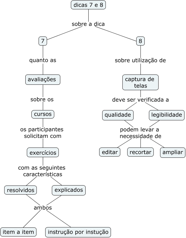 Esse mapa conceitual, produzido no IHMC CmapTools, tem a informação relacionada a: dicas7_8, explicados ambos instrução por instução, exercícios com as seguintes características explicados, qualidade podem levar a necessidade de editar, captura de telas deve ser verificada a qualidade, cursos os participantes solicitam com exercícios, legibilidade podem levar a necessidade de editar, qualidade podem levar a necessidade de recortar, exercícios com as seguintes características resolvidos, qualidade podem levar a necessidade de ampliar, legibilidade podem levar a necessidade de recortar, dicas 7 e 8 sobre a dica 8, 7 quanto as avaliações, explicados ambos item a item, resolvidos ambos item a item, captura de telas deve ser verificada a legibilidade, avaliações sobre os cursos, resolvidos ambos instrução por instução, dicas 7 e 8 sobre a dica 7, 8 sobre utilização de captura de telas, legibilidade podem levar a necessidade de ampliar