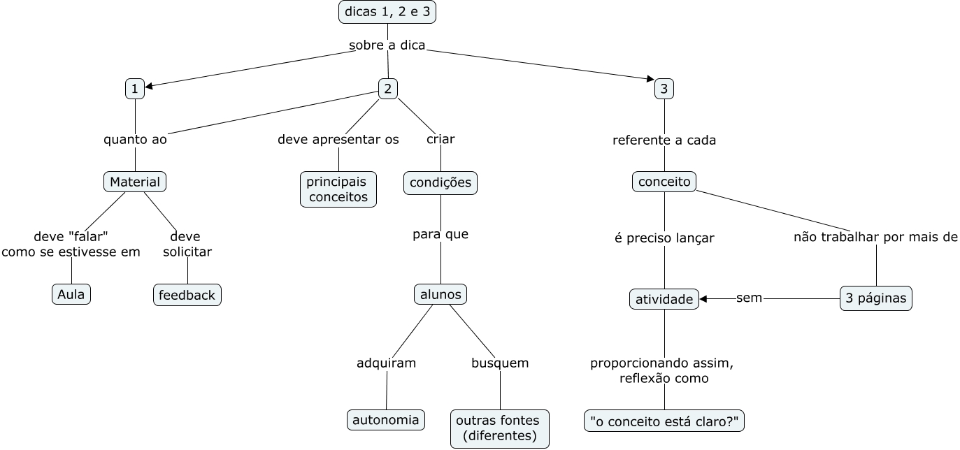 Esse mapa conceitual, produzido no IHMC CmapTools, tem a informação relacionada a: dicas1_2_3, Material deve "falar" como se estivesse em Aula, dicas 1, 2 e 3 sobre a dica 2, conceito é preciso lançar atividade, dicas 1, 2 e 3 sobre a dica 1, 3 referente a cada conceito, alunos busquem outras fontes (diferentes), dicas 1, 2 e 3 sobre a dica 3, Material deve solicitar feedback, 2 criar condições, condições para que alunos, 3 páginas sem atividade, 2 deve apresentar os principais conceitos, 2 quanto ao Material, 1 quanto ao Material, atividade proporcionando assim, reflexão como "o conceito está claro?", conceito não trabalhar por mais de 3 páginas, alunos adquiram autonomia