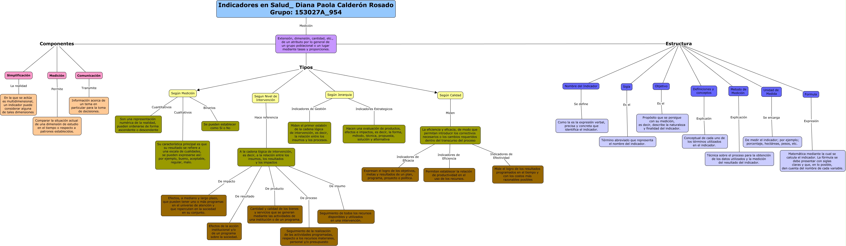 Este Cmap, tiene información relacionada con: Indicadores en Salud, Medición Permite Comparar la situación actual de una dimensión de estudio en el tiempo o respecto a patrones establecidos., Formula Expresión Matemática mediante la cual se calcula el indicador. La fórmula se debe presentar con siglas claras y que, en lo posible, den cuenta del nombre de cada variable., Extensión, dimensión, cantidad, etc., de un atributo por lo general de un grupo poblacional o un lugar mediante tasas y proporciones. Estructura Objetivo, Según Medición Cualitativos Su característica principal es que su resultado se refiere a una escala de cualidades, se pueden expresarse así: por ejemplo, bueno, aceptable, regular, malo., Metodo de Medición Explicación Técnica sobre el proceso para la obtención de los datos utilizados y la medición del resultado del indicador., Sigla Es el Término abreviado que representa el nombre del indicador., Extensión, dimensión, cantidad, etc., de un atributo por lo general de un grupo poblacional o un lugar mediante tasas y proporciones. Tipos Según Calidad, Simplificación La realidad En la que se actúa es multidimensional, un indicador puede considerar alguna de tales dimensiones, Según Medición Binarios Se pueden establecer como Si o No, Extensión, dimensión, cantidad, etc., de un atributo por lo general de un grupo poblacional o un lugar mediante tasas y proporciones. Estructura Sigla, Extensión, dimensión, cantidad, etc., de un atributo por lo general de un grupo poblacional o un lugar mediante tasas y proporciones. Estructura Nombre del Indicador, Extensión, dimensión, cantidad, etc., de un atributo por lo general de un grupo poblacional o un lugar mediante tasas y proporciones. Tipos Según Medición, Extensión, dimensión, cantidad, etc., de un atributo por lo general de un grupo poblacional o un lugar mediante tasas y proporciones. Componentes Comunicación, Objetivo Es el Propósito que se persigue con su medición, es decir, describe la naturaleza y finalidad del indicador., A la cadena lógica de intervención, es decir, a la relación entre los insumos, los resultados y los impactos De resultado Efectos de la acción institucional y/o de un programa sobre la sociedad., Según Jerarquia Indicadores Estrategicos Hacen una evaluación de productos, efectos e impactos, es decir, la forma, método, técnica, propuesta, solución y alternativa, Indicadores en Salud_ Diana Paola Calderón Rosado Grupo: 153027A_954 Medición Extensión, dimensión, cantidad, etc., de un atributo por lo general de un grupo poblacional o un lugar mediante tasas y proporciones., Extensión, dimensión, cantidad, etc., de un atributo por lo general de un grupo poblacional o un lugar mediante tasas y proporciones. Estructura Metodo de Medición, La eficiencia y eficacia, de modo que permitan introducir los correctivos necesarios o los cambios requeridos dentro del transcurso del proceso Indicadores de Efectividad Mide el logro de los resultados programados en el tiempo y con los costos más razonables posibles, La eficiencia y eficacia, de modo que permitan introducir los correctivos necesarios o los cambios requeridos dentro del transcurso del proceso Indicadores de Eficacia Expresan el logro de los objetivos, metas y resultados de un plan, programa, proyecto o política.
