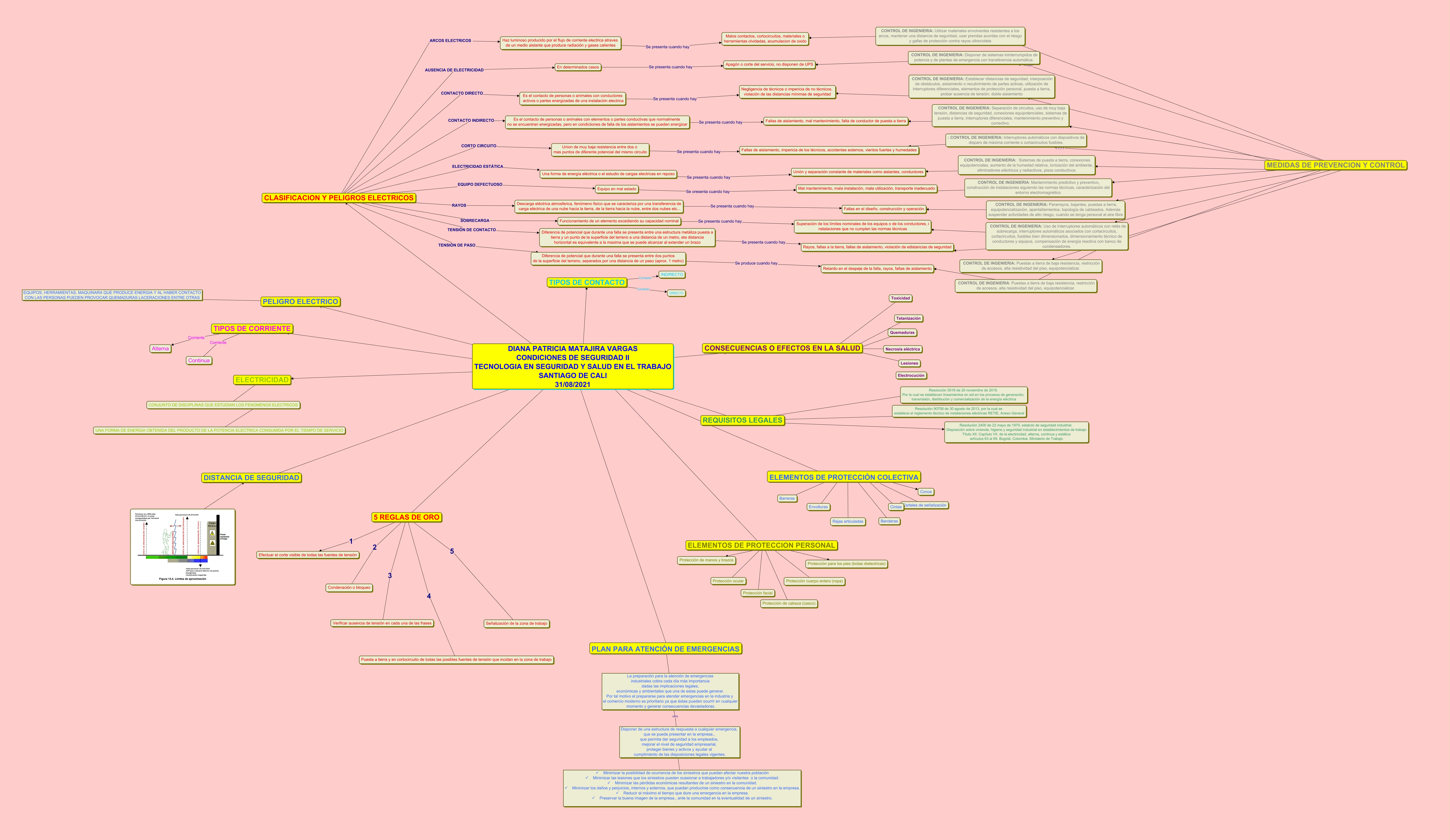 Este Cmap, tiene información relacionada con: PELIGRO ELECTRICO, TIPOS DE CONTACTO Contacto DIRECTO, CLASIFICACION Y PELIGROS ELECTRICOS TENSIÓN DE PASO Diferencia de potencial que durante una falla se presenta entre dos puntos de la superficie del terreno, separados por una distancia de un paso (aprox. 1 metro), CLASIFICACION Y PELIGROS ELECTRICOS ARCOS ELECTRICOS Haz luminoso producido por el flujo de corriente electrica atraves de un medio aislante que produce radiación y gases calientes, DIANA PATRICIA MATAJIRA VARGAS CONDICIONES DE SEGURIDAD II TECNOLOGIA EN SEGURIDAD Y SALUD EN EL TRABAJO SANTIAGO DE CALI 31/08/2021 ???? 5 REGLAS DE ORO, CONTROL DE INGENIERIA: Establecer distancias de seguridad, interposición de obstáculos, aislamiento o recubrimiento de partes activas, utilización de interruptores diferenciales, elementos de protección personal, puesta a tierra, probar ausencia de tensión, doble aislamiento ???? Negligencia de técnicos o impericia de no técnicos, violación de las distancias mínimas de seguridad, La preparación para la atención de emergencias industriales cobra cada día más importancia dadas las implicaciones legales, económicas y ambientales que una de estas puede generar. Por tal motivo el prepararse para atender emergencias en la industria y el comercio moderno es prioritario ya que éstas pueden ocurrir en cualquier momento y generar consecuencias devastadoras. ???? Disponer de una estructura de respuesta a cualquier emergencia, que se pueda presentar en la empresa., que permita dar seguridad a los empleados, mejorar el nivel de seguridad empresarial, proteger bienes y activos y ayudar al cumplimiento de las disposiciones legales vigentes., ELEMENTOS DE PROTECCIÓN COLECTIVA ???? Banderas, REQUISITOS LEGALES ???? Resolución 2400 de 22 mayo de 1979, estatuto de seguridad industrial. Disposición sobre vivienda, higiene y seguridad industrial en establecimientos de trabajo Título XII. Capítulo VII. de la electricidad, alterna, continua y estática artículos 63 al 69. Bogotá, Colombia. Ministerio de Trabajo, MEDIDAS DE PREVENCION Y CONTROL ???? CONTROL DE INGENIERIA: Puestas a tierra de baja resistencia, restricción de accesos, alta resistividad del piso, equipotencializar., MEDIDAS DE PREVENCION Y CONTROL ???? CONTROL DE INGENIERIA: Separación de circuitos, uso de muy baja tensión, distancias de seguridad, conexiones equipotenciales, sistemas de puesta a tierra, interruptores diferenciales, mantenimiento preventivo y correctivo., DIANA PATRICIA MATAJIRA VARGAS CONDICIONES DE SEGURIDAD II TECNOLOGIA EN SEGURIDAD Y SALUD EN EL TRABAJO SANTIAGO DE CALI 31/08/2021 ???? CONSECUENCIAS O EFECTOS EN LA SALUD, : CONTROL DE INGENIERIA: Interruptores automáticos con dispositivos de disparo de máxima corriente o cortacircuitos fusibles. ???? Fallas de aislamiento, impericia de los técnicos, accidentes externos, vientos fuertes y humedades, CONTROL DE INGENIERIA: Pararrayos, bajantes, puestas a tierra, equipotencialización, apantallamientos, topología de cableados. Además suspender actividades de alto riesgo, cuando se tenga personal al aire libre ???? Fallas en el diseño, construcción y operación, Diferencia de potencial que durante una falla se presenta entre una estructura metáliza puesta a tierra y un punto de la superficie del terreno a una distancia de un metro, eta distancia horizontal es equivalente a la maxima que se puede alcanzar al extender un brazo Se presenta cuando hay Rayos, fallas a la tierra, fallas de aislamiento, violación de edistancias de seguridad, MEDIDAS DE PREVENCION Y CONTROL ???? CONTROL DE INGENIERIA: Establecer distancias de seguridad, interposición de obstáculos, aislamiento o recubrimiento de partes activas, utilización de interruptores diferenciales, elementos de protección personal, puesta a tierra, probar ausencia de tensión, doble aislamiento, CONTROL DE INGENIERIA: Puestas a tierra de baja resistencia, restricción de accesos, alta resistividad del piso, equipotencializar. ???? Retardo en el despeje de la falla, rayos, faltas de aislamiento, 5 REGLAS DE ORO 1 Efectuar el corte visible de todas las fuentes de tensión, ELEMENTOS DE PROTECCION PERSONAL ???? Protección facial, ELEMENTOS DE PROTECCIÓN COLECTIVA ???? Cintas, PLAN PARA ATENCIÓN DE EMERGENCIAS ???? La preparación para la atención de emergencias industriales cobra cada día más importancia dadas las implicaciones legales, económicas y ambientales que una de estas puede generar. Por tal motivo el prepararse para atender emergencias en la industria y el comercio moderno es prioritario ya que éstas pueden ocurrir en cualquier momento y generar consecuencias devastadoras.
