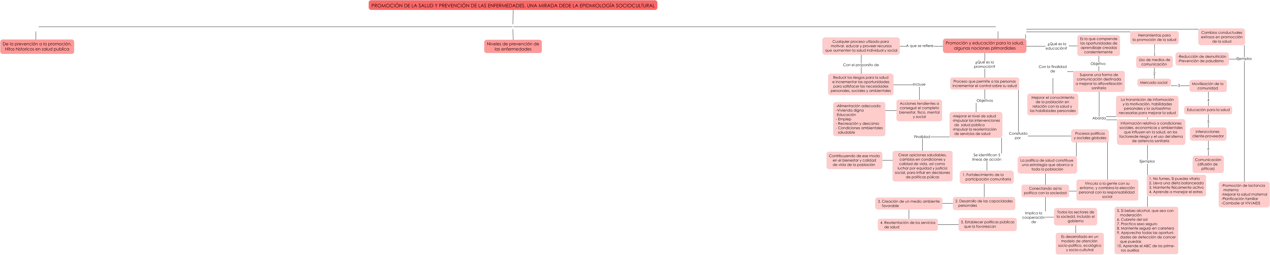 Este Cmap, tiene información relacionada con: Salud Publica, Es la que comprende las oportunidades de aprendizaje creadas consientemente Objetivo Supone una forma de comunicación destinada a mejorar la alfavetización sanitaria, -Mejorar el nivel de salud -Impulsar las intervenciones de salud pública -Impulsar la reorientación de servicios de salud Finalidad Crear opiciones saludables, cambios en condiciones y calidad de vida, así como luchar por equidad y justicia social, para influir en decisiones de políticas púlicas, Promoción y educación para la salud, algunas nociones primordiales Herramientas para la promoción de la salud, 3. Creación de un medio ambiente favorable ???? 4. Reorientación de los servicios de salud, Cambios conductuales exitosos en promocción de la salud Ejemplos -Reducción de desnutrición -Prevención de paludismo, 1. No fumes. Si puedes vitarlo 2. Lleva una dieta balanceada 3. Mantente fisicamente activo 4. Aprende a manejar el estres ???? 5. Si bebes alcohol, que sea con moderación 6. Cubrete del sol 7. Practica sexo seguro 8. Mantente segurp en carretera 9. Aprpvecha todas las oportuni- dades de detección de cancer que puedas 10. Aprende el ABC de los prime- ros auxilios, 1. Fortalecimiento de la participación comunitaria ???? 2. Desarrollo de las capacidades personales, PROMOCIÓN DE LA SALUD Y PREVENCIÓN DE LAS ENFERMEDADES. UNA MIRADA DEDE LA EPIDMIOLOGÍA SOCIOCULTURAL Niveles de prevención de las enfermedades, Supone una forma de comunicación destinada a mejorar la alfavetización sanitaria Aborda La transmición de información y la motivación, habilidades personales y la autoestima necesarias para mejorar la salud, ???? De la prevención a la promoción. Hitos historicos en salud publica, Promoción y educación para la salud, algunas nociones primordiales Cambios conductuales exitosos en promocción de la salud, Promoción y educación para la salud, algunas nociones primordiales A que se refiere Cualquier proceso utiizado para motivar, educar y proveer recursos que aumenten la salud individual y social, Herramientas para la promoción de la salud 1 Uso de medios de comunicación, 2. Desarrollo de las capacidades personales ???? 3. Creación de un medio ambiente favorable, Movilización de la comunidad 4 Educación para la salud, Educación para la salud 5 Interacciones cliente-proveedor, Uso de medios de comunicación 2 Mercado social, PROMOCIÓN DE LA SALUD Y PREVENCIÓN DE LAS ENFERMEDADES. UNA MIRADA DEDE LA EPIDMIOLOGÍA SOCIOCULTURAL, Pocesos políticos y sociales globales Vincula a la gente con su entorno, y combina la elección personal con la responsabilidad social, Proceso que permite a las personas incrementar el control sobre su salud Consituido por Pocesos políticos y sociales globales