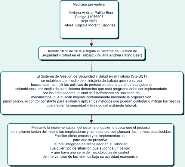 Este Cmap, tiene información relacionada con: Decreto 1072 de 2015 (Regula el Sistema de Gestión de Seguridad y Salud en el Trabajo).(Viviana Andrea Patiño Beer), El Sistema de Gestión de Seguridad y Salud en el Trabajo (SG-SST) se establece por medio del ministerio de trabajo quien a su vez busca hacer cumplir las politicas de proteccion laboral para los trabajadores colombianos, por medio de este sistema determina que este programa debe ser implementado por los empleadores el cual se fundfamenta en una serie de mecanismos que buscan mejorar continuamente mediante la organizacion planificacion, el control constante para evaluar y aplicar los metodos que puedan controlar o mitigar los riesgos que afecten la seguridad y la salud del mabiente laboral. ???? Mediante la implementacion del sistema el gobierno busca que el proceso de implementacion del mismo los empleadores y contratantes cumplancon las normas establecidas Facilitar dicho proceso y su implementacion para que se preserve la total integrdad del trabajador en su labor en cualquier tipo de situacion que suponga un peligro y que haya una serie de metodologias de control de intervencion de los mismos bajo su actividad economica., Medicina preventiva Viviana Andrea Patiño Beer Codigo 41956807 sept 2021 Tutora Gigliola Moranti Sánchez ???? Decreto 1072 de 2015 (Regula el Sistema de Gestión de Seguridad y Salud en el Trabajo).(Viviana Andrea Patiño Beer), Decreto 1072 de 2015 (Regula el Sistema de Gestión de Seguridad y Salud en el Trabajo).(Viviana Andrea Patiño Beer) ???? El Sistema de Gestión de Seguridad y Salud en el Trabajo (SG-SST) se establece por medio del ministerio de trabajo quien a su vez busca hacer cumplir las politicas de proteccion laboral para los trabajadores colombianos, por medio de este sistema determina que este programa debe ser implementado por los empleadores el cual se fundfamenta en una serie de mecanismos que buscan mejorar continuamente mediante la organizacion planificacion, el control constante para evaluar y aplicar los metodos que puedan controlar o mitigar los riesgos que afecten la seguridad y la salud del mabiente laboral.