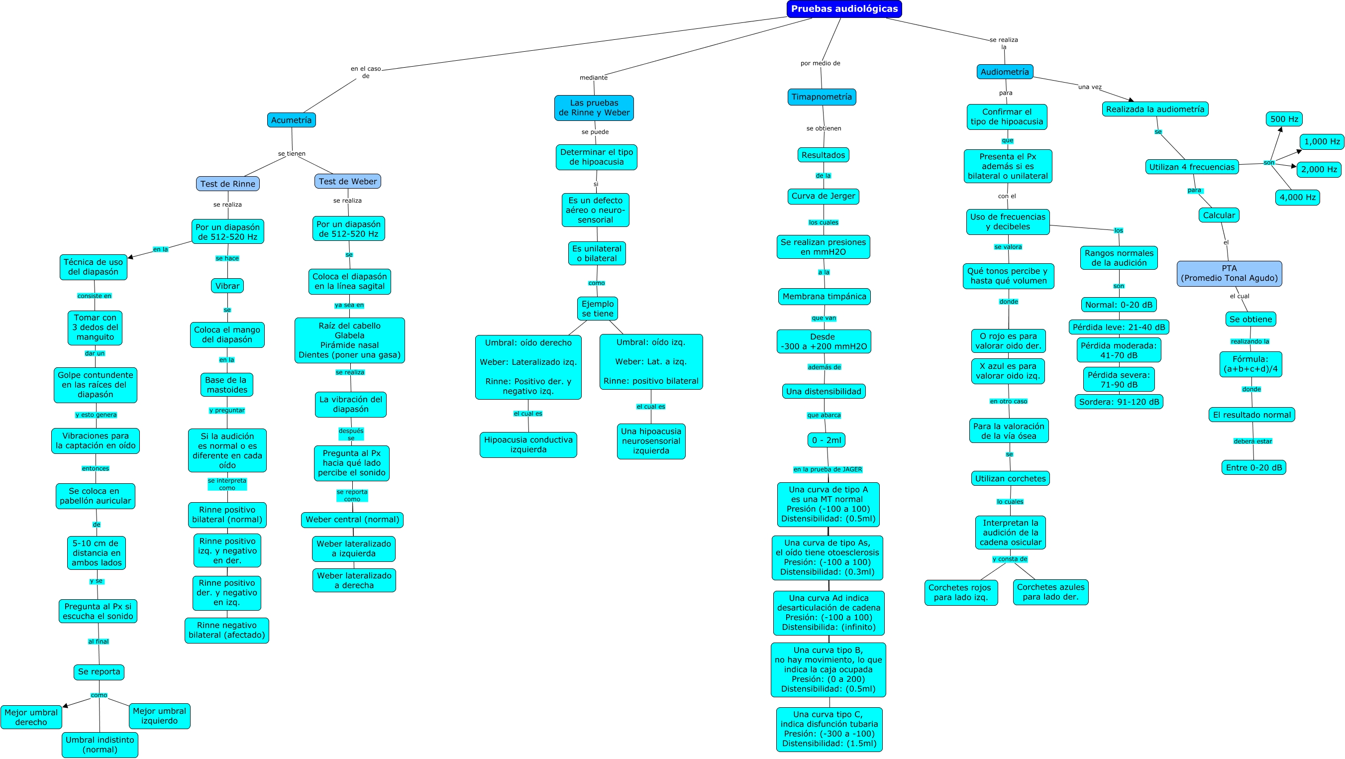 Este Cmap, tiene información relacionada con: Pruebas de audio, Pruebas audiológicas en el caso de Acumetría, Por un diapasón de 512-520 Hz en la Técnica de uso del diapasón, X azul es para valorar oido izq. en otro caso Para la valoración de la vía ósea, Coloca el mango del diapasón en la Base de la mastoides, Utilizan 4 frecuencias para Calcular, Se realizan presiones en mmH2O a la Membrana timpánica, Audiometría para Confirmar el tipo de hipoacusia, Uso de frecuencias y decibeles los Rangos normales de la audición, Calcular el PTA (Promedio Tonal Agudo), Utilizan 4 frecuencias son 2,000 Hz, Test de Weber se realiza Por un diapasón de 512-520 Hz, Coloca el diapasón en la línea sagital ya sea en Raíz del cabello Glabela Pirámide nasal Dientes (poner una gasa), Rinne positivo bilateral (normal) ???? Rinne positivo der. y negativo en izq., Pregunta al Px hacia qué lado percibe el sonido se reporta como Weber lateralizado a derecha, Test de Rinne se realiza Por un diapasón de 512-520 Hz, Utilizan 4 frecuencias son 500 Hz, Rangos normales de la audición son Pérdida leve: 21-40 dB, Pregunta al Px si escucha el sonido al final Se reporta, Confirmar el tipo de hipoacusia que Presenta el Px además si es bilateral o unilateral, Una distensibilidad que abarca 0 - 2ml