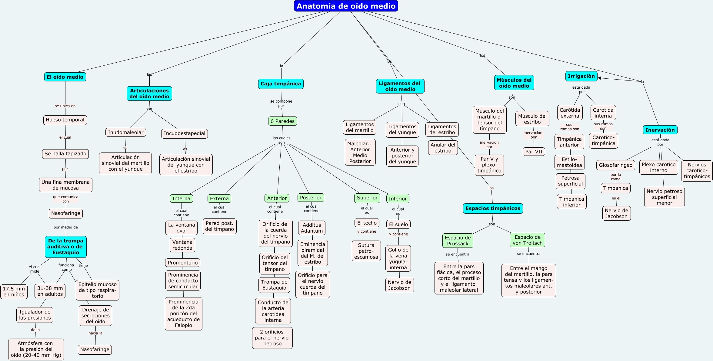 Este Cmap, tiene información relacionada con: Anatomía de oído medio, Espacios timpánicos son Espacio de Prussack, Carótida externa sus ramas son Petrosa superficial, 6 Paredes las cuales son Externa, Interna el cual contiene Prominencia de conducto semicircular, 6 Paredes las cuales son Interna, Nasofaringe por medio de De la trompa auditiva o de Eustaquio, Anatomía de oído medio la Caja timpánica, Incudoestapedial es Articulación sinovial del yunque con el estribo, Ligamentos del oído medio son Ligamentos del estribo, Carótida interna sus ramas son Carotico- timpánica, Caja timpánica se compone por 6 Paredes, Una fina membrana de mucosa que comunica con Nasofaringe, Espacio de von Troltsch se encuentra Entre el mango del martillo, la pars tensa y los ligamen- tos maleolares ant. y posterior, Anatomía de oído medio ???? El oído medio, Posterior el cual contiene Orificio para el nervio cuerda del tímpano, Drenaje de secreciones del oído hacia la Nasofaringe, Externa el cual contiene Pared post. del tímpano, El oído medio se ubica en Hueso temporal, Anatomía de oído medio los Espacios timpánicos, 6 Paredes las cuales son Inferior