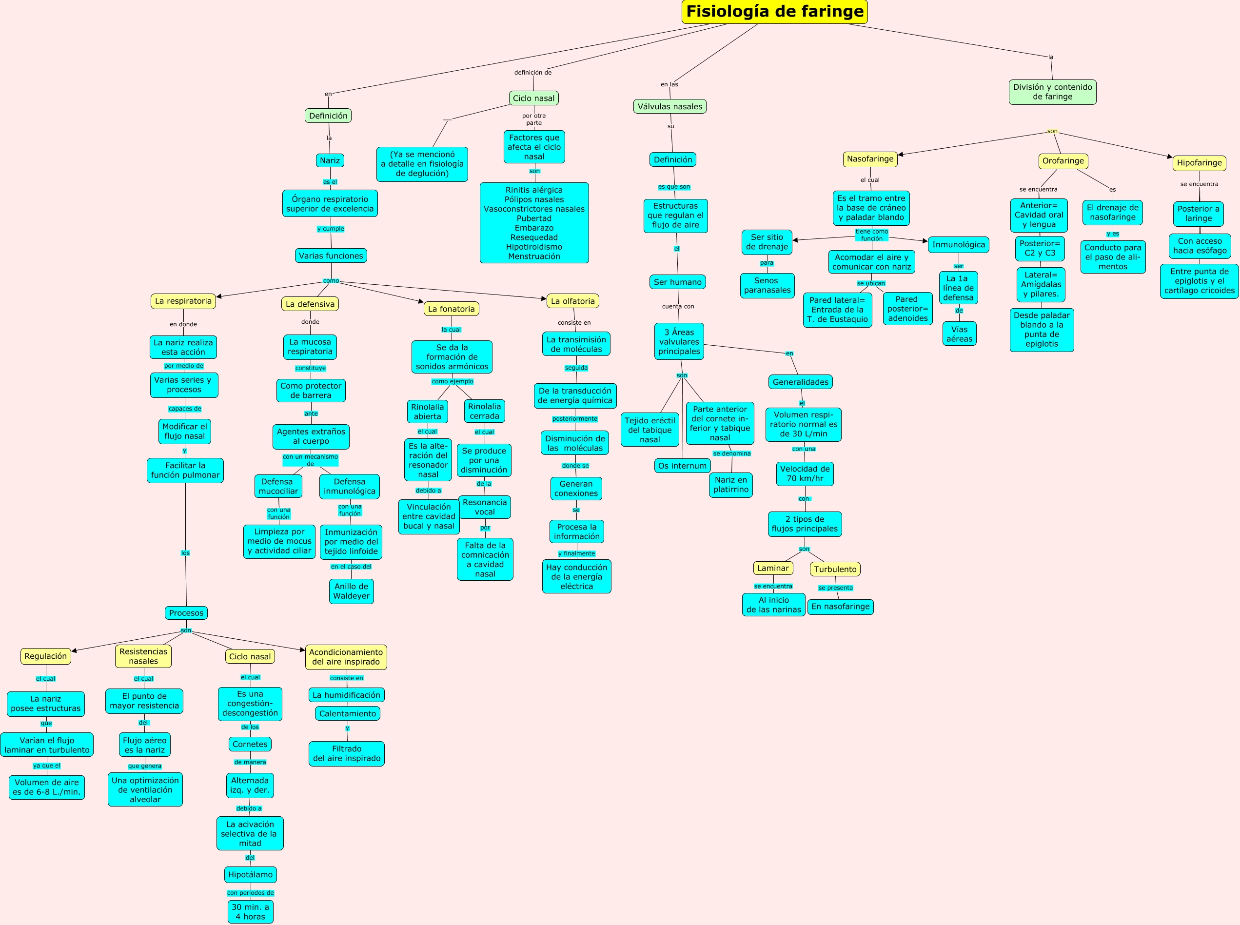 Este Cmap, tiene información relacionada con: Fisiología de faringe nariz, Laminar se encuentra Al inicio de las narinas, Es el tramo entre la base de cráneo y paladar blando tiene como función Inmunológica, La defensiva donde La mucosa respiratoria, Es una congestión- descongestión de los Cornetes, Hipofaringe se encuentra Entre punta de epiglotis y el cartílago cricoides, La olfatoria consiste en La transimisión de moléculas, Procesos son Acondicionamiento del aire inspirado, La 1a línea de defensa de Vías aéreas, Alternada izq. y der. debido a La acivación selectiva de la mitad, 3 Áreas valvulares principales son Parte anterior del cornete in- ferior y tabique nasal, El punto de mayor resistencia del Flujo aéreo es la nariz, Defensa mucociliar con una función Limpieza por medio de mocus y actividad ciliar, Ser humano cuenta con 3 Áreas valvulares principales, Rinolalia abierta el cual Es la alte- ración del resonador nasal, Válvulas nasales su Definición, Agentes extraños al cuerpo con un mecanismo de Defensa inmunológica, La acivación selectiva de la mitad del Hipotálamo, La fonatoria la cual Se da la formación de sonidos armónicos, Ser sitio de drenaje para Senos paranasales, Como protector de barrera ante Agentes extraños al cuerpo