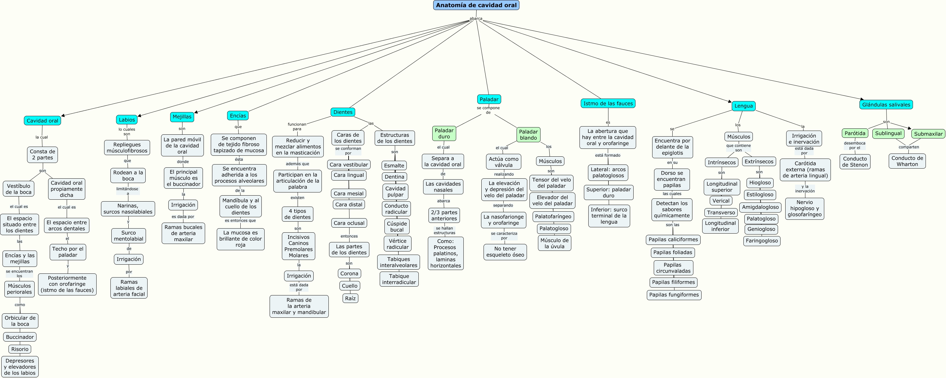 Este Cmap, tiene información relacionada con: Anatomía cavidad oral, Paladar blando el cual Actúa como válvula, Irrigación e inervación está dada por Carótida externa (ramas de arteria lingual), Las partes de los dientes son Raíz, 4 tipos de dientes son Incisivos Caninos Premolares Molares, Detectan los sabores químicamente son las Papilas circunvaladas, Músculos que contiene son Intrínsecos, Anatomía de cavidad oral abarca Lengua, Extrínsecos son Faringogloso, 2/3 partes anteriores se hallan estructuras Como: Procesos palatinos, laminas horizontales, Vestíbulo de la boca el cual es El espacio situado entre los dientes, Caras de los dientes se conforman por Cara distal, Anatomía de cavidad oral abarca Dientes, Separa a la cavidad oral de Las cavidades nasales, La pared móvil de la cavidad oral donde El principal músculo es el buccinador, Detectan los sabores químicamente son las Papilas caliciformes, Paladar duro el cual Separa a la cavidad oral, Caras de los dientes se conforman por Cara lingual, Anatomía de cavidad oral abarca Encías, Estructuras de los dientes son Dentina, Anatomía de cavidad oral abarca Labios