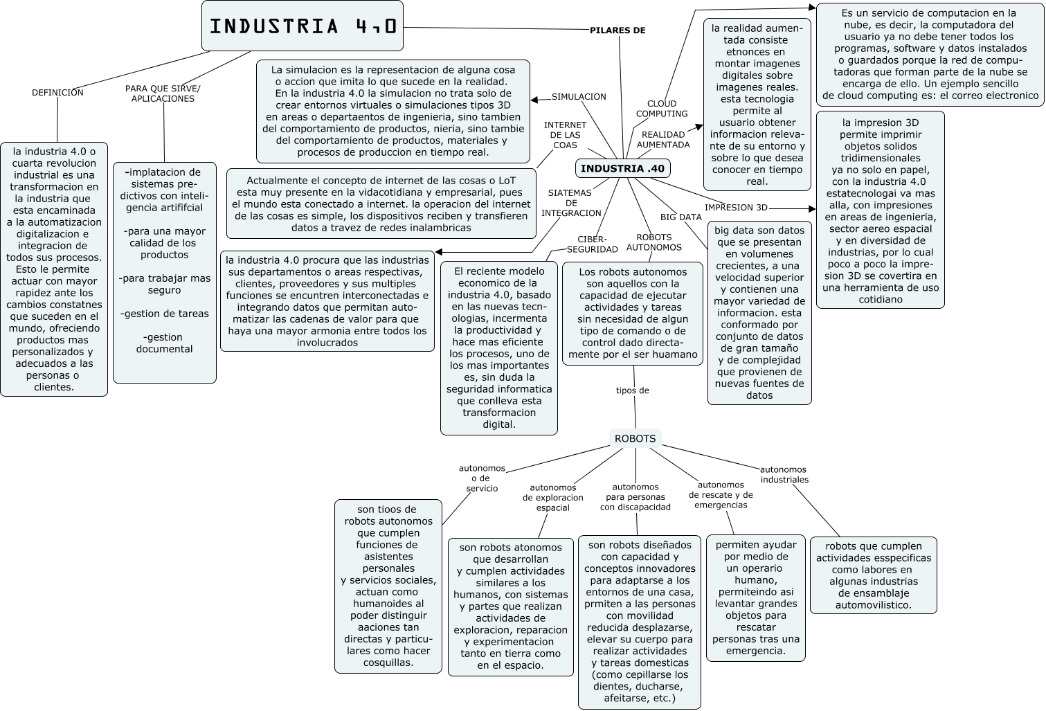 Este Cmap, tiene información relacionada con: 103_TIC_S1_E1, Los robots autonomos son aquellos con la capacidad de ejecutar actividades y tareas sin necesidad de algun tipo de comando o de control dado directa- mente por el ser huamano tipos de ROBOTS, INDUSTRIA 4,0 DEFINICION la industria 4.0 o cuarta revolucion industrial es una transformacion en la industria que esta encaminada a la automatizacion digitalizacion e integracion de todos sus procesos. Esto le permite actuar con mayor rapidez ante los cambios constatnes que suceden en el mundo, ofreciendo productos mas personalizados y adecuados a las personas o clientes., INDUSTRIA .40 REALIDAD AUMENTADA la realidad aumen- tada consiste etnonces en montar imagenes digitales sobre imagenes reales. esta tecnologia permite al usuario obtener informacion releva- nte de su entorno y sobre lo que desea conocer en tiempo real., INDUSTRIA .40 CIBER- SEGURIDAD El reciente modelo economico de la industria 4.0, basado en las nuevas tecn- ologias, incermenta la productividad y hace mas eficiente los procesos, uno de los mas importantes es, sin duda la seguridad informatica que conlleva esta transformacion digital., INDUSTRIA 4,0 PARA QUE SIRVE/ APLICACIONES -implatacion de sistemas pre- dictivos con inteli- gencia artififcial -para una mayor calidad de los productos -para trabajar mas seguro -gestion de tareas -gestion documental, INDUSTRIA .40 SIMULACION La simulacion es la representacion de alguna cosa o accion que imita lo que sucede en la realidad. En la industria 4.0 la simulacion no trata solo de crear entornos virtuales o simulaciones tipos 3D en areas o departaentos de ingenieria, sino tambien del comportamiento de productos, nieria, sino tambie del comportamiento de productos, materiales y procesos de produccion en tiempo real., ROBOTS autonomos industriales robots que cumplen actividades esspecificas como labores en algunas industrias de ensamblaje automovilistico., INDUSTRIA .40 ROBOTS AUTONOMOS Los robots autonomos son aquellos con la capacidad de ejecutar actividades y tareas sin necesidad de algun tipo de comando o de control dado directa- mente por el ser huamano, INDUSTRIA .40 SIATEMAS DE INTEGRACION la industria 4.0 procura que las industrias sus departamentos o areas respectivas, clientes, proveedores y sus multiples funciones se encuntren interconectadas e integrando datos que permitan auto- matizar las cadenas de valor para que haya una mayor armonia entre todos los involucrados, INDUSTRIA 4,0 PILARES DE INDUSTRIA .40, ROBOTS autonomos o de servicio son tioos de robots autonomos que cumplen funciones de asistentes personales y servicios sociales, actuan como humanoides al poder distinguir aaciones tan directas y particu- lares como hacer cosquillas., INDUSTRIA .40 CLOUD COMPUTING Es un servicio de computacion en la nube, es decir, la computadora del usuario ya no debe tener todos los programas, software y datos instalados o guardados porque la red de compu- tadoras que forman parte de la nube se encarga de ello. Un ejemplo sencillo de cloud computing es: el correo electronico, ROBOTS autonomos de exploracion espacial son robots atonomos que desarrollan y cumplen actividades similares a los humanos, con sistemas y partes que realizan actividades de exploracion, reparacion y experimentacion tanto en tierra como en el espacio., INDUSTRIA .40 INTERNET DE LAS COAS Actualmente el concepto de internet de las cosas o LoT esta muy presente en la vidacotidiana y empresarial, pues el mundo esta conectado a internet. la operacion del internet de las cosas es simple, los dispositivos reciben y transfieren datos a travez de redes inalambricas, INDUSTRIA .40 BIG DATA big data son datos que se presentan en volumenes crecientes, a una velocidad superior y contienen una mayor variedad de informacion. esta conformado por conjunto de datos de gran tamaño y de complejidad que provienen de nuevas fuentes de datos, ROBOTS autonomos para personas con discapacidad son robots diseñados con capacidad y conceptos innovadores para adaptarse a los entornos de una casa, prmiten a las personas con movilidad reducida desplazarse, elevar su cuerpo para realizar actividades y tareas domesticas (como cepillarse los dientes, ducharse, afeitarse, etc.), ROBOTS autonomos de rescate y de emergencias permiten ayudar por medio de un operario humano, permiteindo asi levantar grandes objetos para rescatar personas tras una emergencia., INDUSTRIA .40 IMPRESION 3D la impresion 3D permite imprimir objetos solidos tridimensionales ya no solo en papel, con la industria 4.0 estatecnologai va mas alla, con impresiones en areas de ingenieria, sector aereo espacial y en diversidad de industrias, por lo cual poco a poco la impre- sion 3D se covertira en una herramienta de uso cotidiano