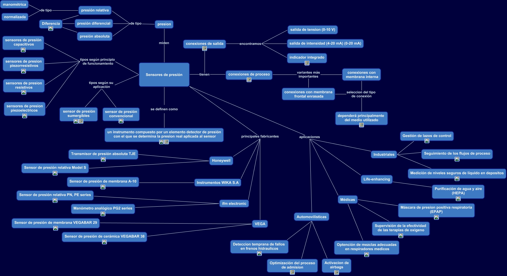 Este Cmap, tiene información relacionada con: SENSORES DE PRESIÓN, conexiones con membrana frontal enrasada seleccion del tipo de conexión dependerá principalmente del medio utilizado, Sensores de presión tipos según su aplicación sensor de presión convencional, Industriales ???? Seguimiento de los flujos de proceso, presion de tipo presión relativa, presión relativa ???? Diferencia, Médicas ???? Optención de mezclas adecuadas en respiradores medicos, Sensores de presión principales fabricantes VEGA, Automovilísticas ???? Optimización del proceso de admision, Automovilísticas ???? Activacion de airbags, Life-enhancing ???? Purificación de agua y aire (HEPA), Industriales ???? Gestión de lazos de control, presión diferencial ???? Diferencia, Sensores de presión aplicaciones Life-enhancing, Sensores de presión principales fabricantes Instrumentos WIKA S.A, Sensores de presión tipos según principio de funcionamiento sensores de presión capacitivos, conexiones de salida encontramos indicador integrado, conexiones de salida encontramos salida de intensidad (4-20 mA) (0-20 mA), presión absoluta ???? Diferencia, Sensores de presión aplicaciones Médicas, Sensores de presión tipos según principio de funcionamiento sensores de presion piezorresistivos