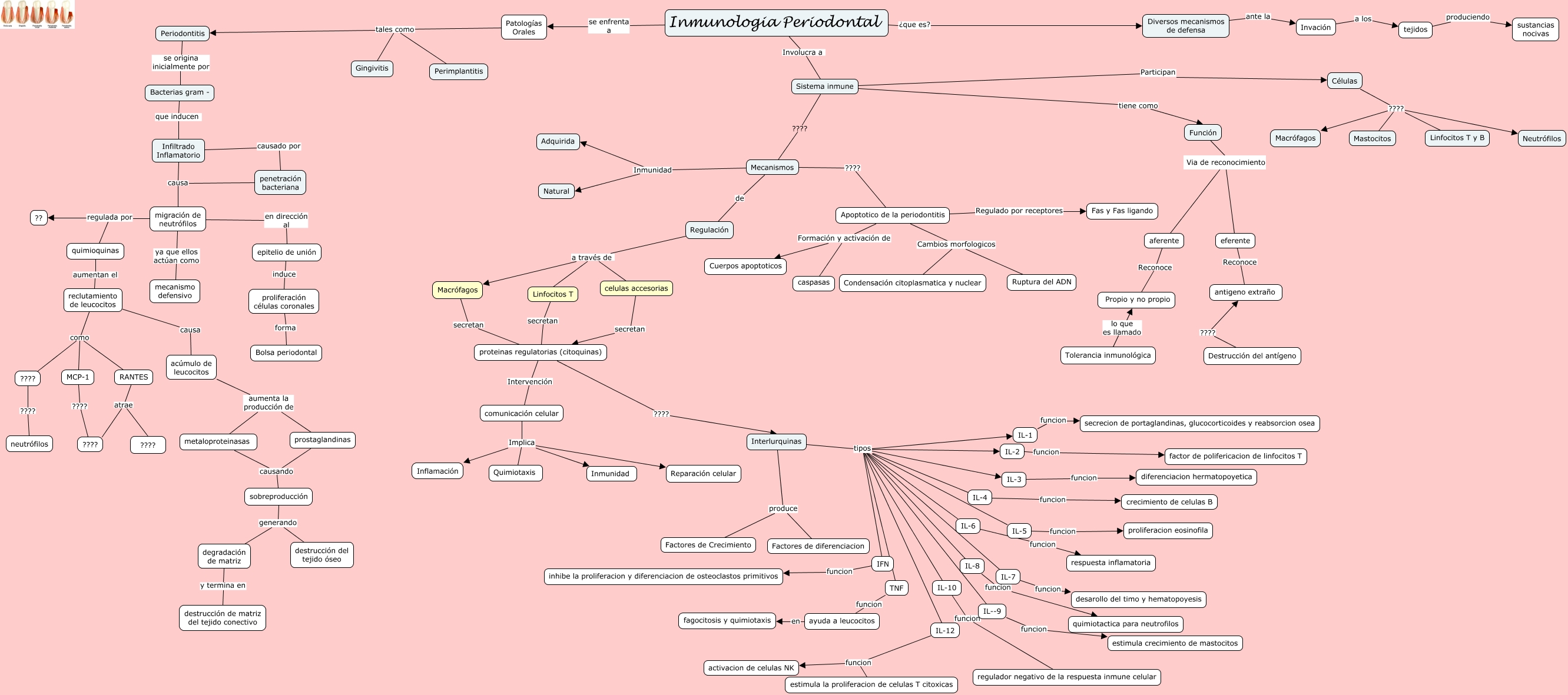 Este Cmap, tiene información relacionada con: mapa conceptual 1, RANTES atrae ????, migración de neutrófilos regulada por ??, prostaglandinas causando sobreproducción, Interlurquinas tipos IL--9, migración de neutrófilos regulada por quimioquinas, Diversos mecanismos de defensa ante la Invación, Mecanismos de Regulación, Regulación a través de Macrófagos, Interlurquinas tipos IL-10, proteinas regulatorias (citoquinas) Intervención comunicación celular, Interlurquinas produce Factores de diferenciacion, Mecanismos Inmunidad Adquirida, ???? ???? neutrófilos, Regulación a través de celulas accesorias, ayuda a leucocitos en fagocitosis y quimiotaxis, Células ???? Linfocitos T y B, Apoptotico de la periodontitis Cambios morfologicos Condensación citoplasmatica y nuclear, IL--9 funcion estimula crecimiento de mastocitos, Apoptotico de la periodontitis Regulado por receptores Fas y Fas ligando, Sistema inmune Participan Células