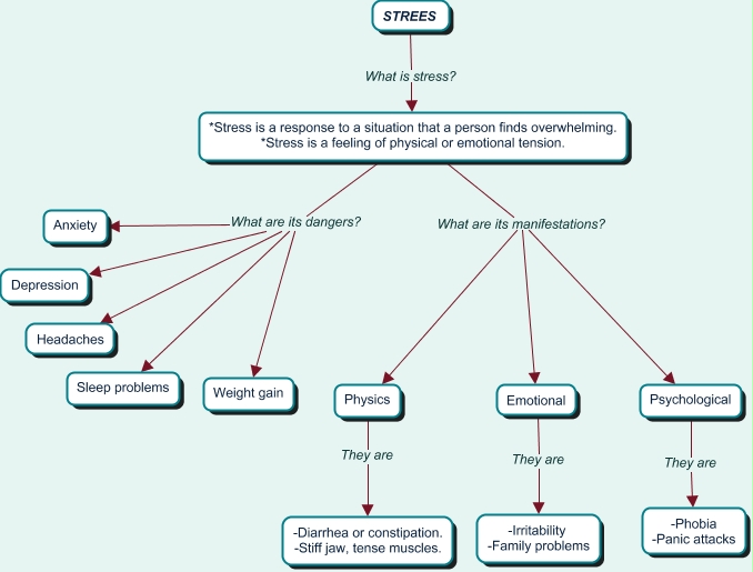 Este Cmap, tiene información relacionada con: Conceptual map, *Stress is a response to a situation that a person finds overwhelming. *Stress is a feeling of physical or emotional tension. What are its manifestations? Psychological, *Stress is a response to a situation that a person finds overwhelming. *Stress is a feeling of physical or emotional tension. What are its dangers? Headaches, *Stress is a response to a situation that a person finds overwhelming. *Stress is a feeling of physical or emotional tension. What are its dangers? Depression, Physics They are -Diarrhea or constipation. -Stiff jaw, tense muscles., *Stress is a response to a situation that a person finds overwhelming. *Stress is a feeling of physical or emotional tension. What are its dangers? Sleep problems, Psychological They are -Phobia -Panic attacks, *Stress is a response to a situation that a person finds overwhelming. *Stress is a feeling of physical or emotional tension. What are its manifestations? Physics, Emotional They are -Irritability -Family problems, *Stress is a response to a situation that a person finds overwhelming. *Stress is a feeling of physical or emotional tension. What are its manifestations? Emotional, *Stress is a response to a situation that a person finds overwhelming. *Stress is a feeling of physical or emotional tension. What are its dangers? Anxiety, *Stress is a response to a situation that a person finds overwhelming. *Stress is a feeling of physical or emotional tension. What are its dangers? Weight gain, STREES What is stress? *Stress is a response to a situation that a person finds overwhelming. *Stress is a feeling of physical or emotional tension.