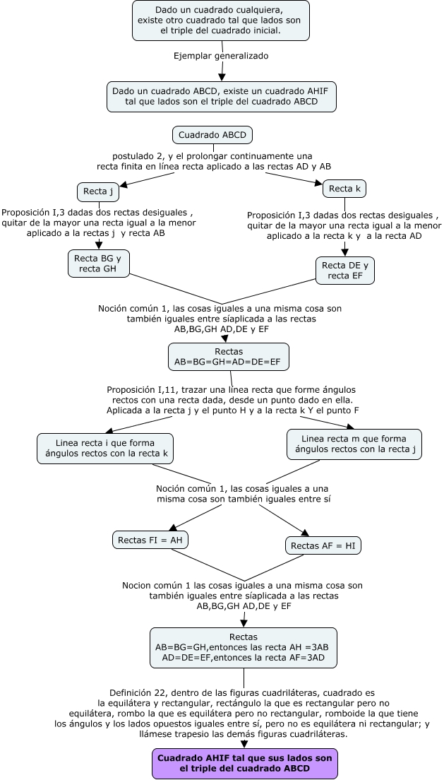Este Cmap, tiene información relacionada con: CUADRADO 3, Linea recta m que forma ángulos rectos con la recta j Noción común 1, las cosas iguales a una misma cosa son también iguales entre sí Rectas AF = HI, Rectas AB=BG=GH=AD=DE=EF Proposición I,11, trazar una línea recta que forme ángulos rectos con una recta dada, desde un punto dado en ella. Aplicada a la recta j y el punto H y a la recta k Y el punto F Linea recta i que forma ángulos rectos con la recta k, Rectas AF = HI Nocion común 1 las cosas iguales a una misma cosa son también iguales entre síaplicada a las rectas AB,BG,GH AD,DE y EF Rectas AB=BG=GH,entonces las recta AH =3AB AD=DE=EF,entonces la recta AF=3AD, Cuadrado ABCD postulado 2, y el prolongar continuamente una recta finita en línea recta aplicado a las rectas AD y AB Recta j, Dado un cuadrado cualquiera, existe otro cuadrado tal que lados son el triple del cuadrado inicial. Ejemplar generalizado Dado un cuadrado ABCD, existe un cuadrado AHIF tal que lados son el triple del cuadrado ABCD, Rectas AB=BG=GH,entonces las recta AH =3AB AD=DE=EF,entonces la recta AF=3AD Definición 22, dentro de las figuras cuadriláteras, cuadrado es la equilátera y rectangular, rectángulo la que es rectangular pero no equilátera, rombo la que es equilátera pero no rectangular, romboide la que tiene los ángulos y los lados opuestos iguales entre sí, pero no es equilátera ni rectangular; y llámese trapesio las demás figuras cuadriláteras. Cuadrado AHIF tal que sus lados son el triple del cuadrado ABCD, Cuadrado ABCD postulado 2, y el prolongar continuamente una recta finita en línea recta aplicado a las rectas AD y AB Recta k, Linea recta i que forma ángulos rectos con la recta k Noción común 1, las cosas iguales a una misma cosa son también iguales entre sí Rectas AF = HI, Linea recta m que forma ángulos rectos con la recta j Noción común 1, las cosas iguales a una misma cosa son también iguales entre sí Rectas FI = AH, Recta j Proposición I,3 dadas dos rectas desiguales , quitar de la mayor una recta igual a la menor aplicado a la rectas j y recta AB Recta BG y recta GH, Recta k Proposición I,3 dadas dos rectas desiguales , quitar de la mayor una recta igual a la menor aplicado a la recta k y a la recta AD Recta DE y recta EF, Linea recta i que forma ángulos rectos con la recta k Noción común 1, las cosas iguales a una misma cosa son también iguales entre sí Rectas FI = AH, Recta DE y recta EF Noción común 1, las cosas iguales a una misma cosa son también iguales entre síaplicada a las rectas AB,BG,GH AD,DE y EF Rectas AB=BG=GH=AD=DE=EF, Rectas AB=BG=GH=AD=DE=EF Proposición I,11, trazar una línea recta que forme ángulos rectos con una recta dada, desde un punto dado en ella. Aplicada a la recta j y el punto H y a la recta k Y el punto F Linea recta m que forma ángulos rectos con la recta j, Rectas FI = AH Nocion común 1 las cosas iguales a una misma cosa son también iguales entre síaplicada a las rectas AB,BG,GH AD,DE y EF Rectas AB=BG=GH,entonces las recta AH =3AB AD=DE=EF,entonces la recta AF=3AD, Recta BG y recta GH Noción común 1, las cosas iguales a una misma cosa son también iguales entre síaplicada a las rectas AB,BG,GH AD,DE y EF Rectas AB=BG=GH=AD=DE=EF