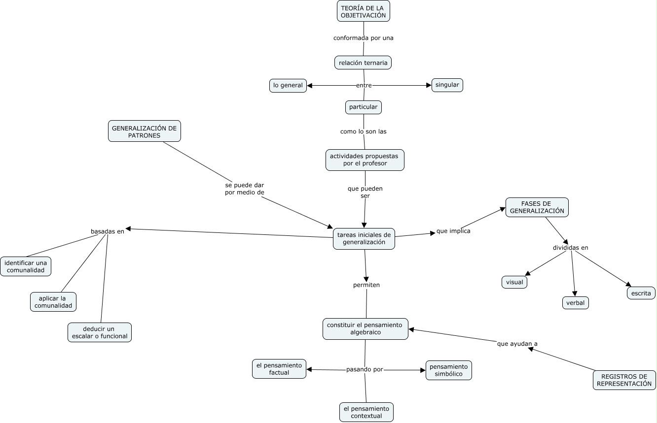 Este Cmap, tiene información relacionada con: marco teórico, tareas iniciales de generalización basadas en aplicar la comunalidad, tareas iniciales de generalización permiten constituir el pensamiento algebraico, actividades propuestas por el profesor que pueden ser tareas iniciales de generalización, particular como lo son las actividades propuestas por el profesor, FASES DE GENERALIZACIÓN divididas en escrita, constituir el pensamiento algebraico pasando por el pensamiento contextual, TEORÍA DE LA OBJETIVACIÓN conformada por una relación ternaria, constituir el pensamiento algebraico pasando por pensamiento simbólico, FASES DE GENERALIZACIÓN divididas en verbal, tareas iniciales de generalización basadas en deducir un escalar o funcional, relación ternaria entre singular, FASES DE GENERALIZACIÓN divididas en visual, tareas iniciales de generalización basadas en identificar una comunalidad, tareas iniciales de generalización que implica FASES DE GENERALIZACIÓN, relación ternaria entre lo general, GENERALIZACIÓN DE PATRONES se puede dar por medio de tareas iniciales de generalización, constituir el pensamiento algebraico pasando por el pensamiento factual, REGISTROS DE REPRESENTACIÓN que ayudan a constituir el pensamiento algebraico, relación ternaria entre particular