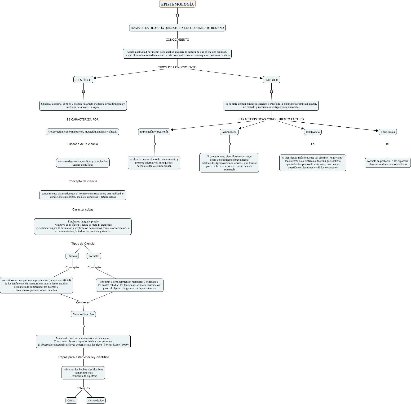 Este Cmap, tiene información relacionada con: Actividad evaluativa 1 Investigacion 4, conocimiento sistemático que el hombre construye sobre una realidad en condiciones históricas, sociales, concretas y determinadas Características -Emplea un lenguaje propio -Se apoya en la lógica y acude al método científico -Se caracteriza por la definición y explicación de métodos como la observación, la experimentación, la inducción, análisis y síntesis, Manera de proceder característica de la ciencia, Consiste en observar aquellos hechos que permiten al observador descubrir las leyes generales que los rigen (Bertran Russell 1969) Etapas para establecer ley científica -observar los hechos significativos -sentar hipótesis -Deducción de hipótesis, Aquella actividad por medio de la cual se adquiere la certeza de que existe una realidad, de que el mundo circundante existe y está dotado de características que no ponemos en duda TIPOS DE CONOCIMIENTO EMPÍRICO, EPISTEMOLOGÍA ES RAMA DE LA FILOSOFÍA QUE ESTUDIA EL CONOCIMIENTO HUMANO, Observación, experimentación, inducción, análisis y síntesis Filosofía de la ciencia cómo se desarrollan, evalúan y cambian las teorías científicas, El hombre común conoce los hechos a través de la experiencia cumplida al azar, sin método y mediante investigaciones personales CARACTERISTICAS CONOCIMIENTO FÁCTICO Acumulacón, -Emplea un lenguaje propio -Se apoya en la lógica y acude al método científico -Se caracteriza por la definición y explicación de métodos como la observación, la experimentación, la inducción, análisis y síntesis Tipos de Ciencia Formales, Aquella actividad por medio de la cual se adquiere la certeza de que existe una realidad, de que el mundo circundante existe y está dotado de características que no ponemos en duda TIPOS DE CONOCIMIENTO CIENTÍFICO, CIENTÍFICO ES Observa, describe, explica y predice su objeto mediante procedimientos y métodos basados en la lógica, -observar los hechos significativos -sentar hipótesis -Deducción de hipótesis Enfoques Crítico, Acumulacón Es El conocimiento científico se construye sobre conocimientos previamente establecidos (proposiciones teóricas) que forman parte de la base teórica existente de cada existencia, EMPÍRICO ES El hombre común conoce los hechos a través de la experiencia cumplida al azar, sin método y mediante investigaciones personales, Método Científico Es Manera de proceder característica de la ciencia, Consiste en observar aquellos hechos que permiten al observador descubrir las leyes generales que los rigen (Bertran Russell 1969), Verificación es consiste en probar la, o las hipótesis planteadas, descartando las falsas, cometido es conseguir una reproducción (mental o artificial) de los fenómenos de la naturaleza que se desea estudiar, de manera de comprender las fuerzas y mecanismos que intervienen en ellos. Conllevan Método Científico, cómo se desarrollan, evalúan y cambian las teorías científicas Concepto de ciencia conocimiento sistemático que el hombre construye sobre una realidad en condiciones históricas, sociales, concretas y determinadas, El hombre común conoce los hechos a través de la experiencia cumplida al azar, sin método y mediante investigaciones personales CARACTERISTICAS CONOCIMIENTO FÁCTICO Relativismo, Observa, describe, explica y predice su objeto mediante procedimientos y métodos basados en la lógica SE CARACTERIZA POR Observación, experimentación, inducción, análisis y síntesis, Relativismo Es El significado más frecuente del término "relativismo" hace referencia al sistema o doctrina que sostiene que todos los puntos de vista sobre una misma cuestión son igualmente válidos o correctos, Explicación y predicción Es explica lo que es objeto de conocimiento y propone alternativas para que los hechos se den o se modifiquen
