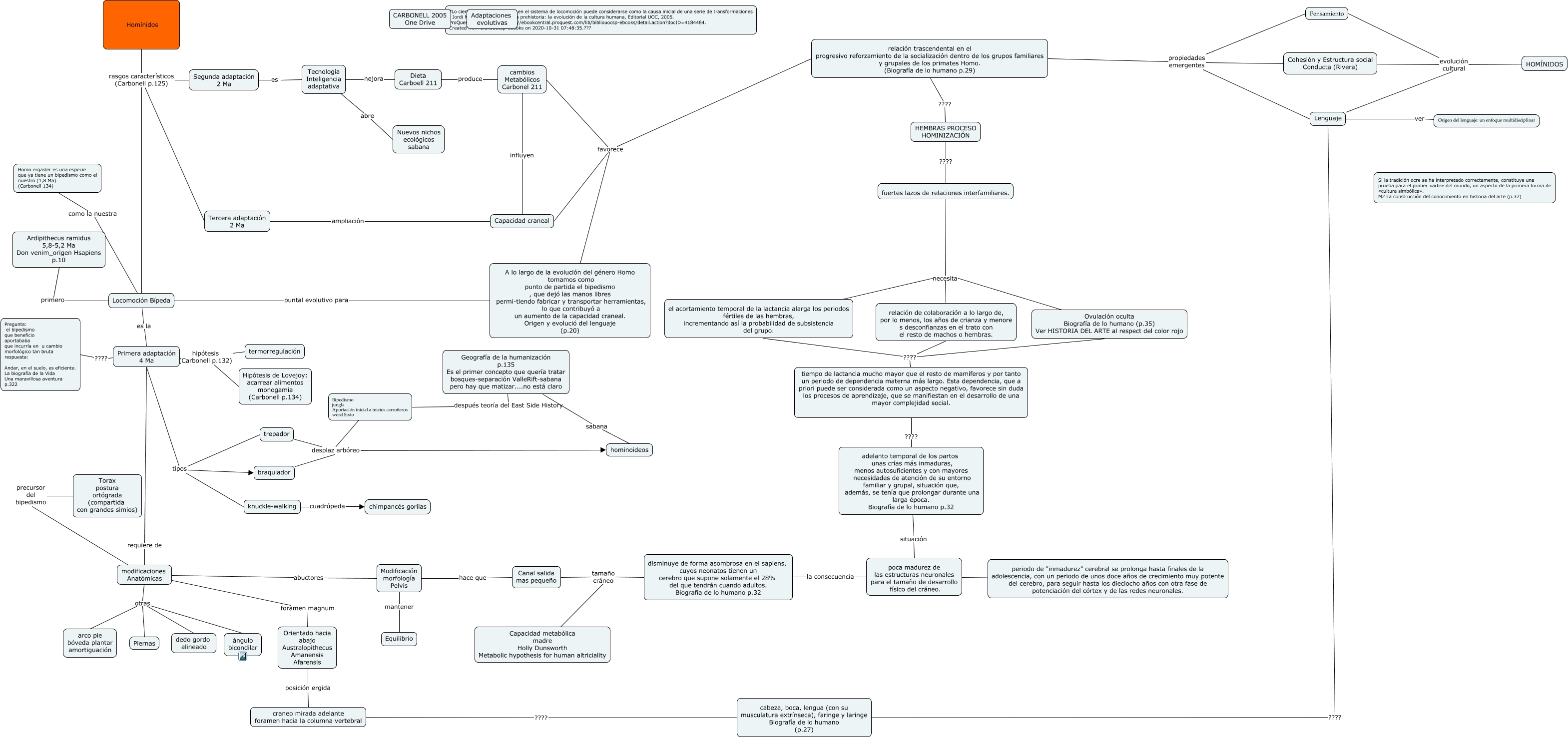 Este Cmap, tiene información relacionada con: BIPEDISMO ANTROPOLOGÍA, Modificación morfología Pelvis mantener Equilibrio, modificaciones Anatómicas abuctores Modificación morfología Pelvis, Tecnología Inteligencia adaptativa nejora Dieta Carboell 211, tiempo de lactancia mucho mayor que el resto de mamíferos y por tanto un periodo de dependencia materna más largo. Esta dependencia, que a priori puede ser considerada como un aspecto negativo, favorece sin duda los procesos de aprendizaje, que se manifiestan en el desarrollo de una mayor complejidad social. ???? relación de colaboración a lo largo de, por lo menos, los años de crianza y menore s desconfianzas en el trato con el resto de machos o hembras., Primera adaptación 4 Ma tipos trepador, Dieta Carboell 211 produce cambios Metabólicos Carbonel 211, relación trascendental en el progresivo reforzamiento de la socialización dentro de los grupos familiares y grupales de los primates Homo. (Biografía de lo humano p.29) propiedades emergentes Lenguaje, A lo largo de la evolución del género Homo tomamos como punto de partida el bipedismo , que dejó las manos libres permi-tiendo fabricar y transportar herramientas, lo que contribuyó a un aumento de la capacidad craneal. Origen y evolució del lenguaje (p.20) favorece cambios Metabólicos Carbonel 211, fuertes lazos de relaciones interfamiliares. ???? HEMBRAS PROCESO HOMINIZACIÓN, poca madurez de las estructuras neuronales para el tamaño de desarrollo físico del cráneo. ???? periodo de “inmadurez” cerebral se prolonga hasta finales de la adolescencia, con un periodo de unos doce años de crecimiento muy potente del cerebro, para seguir hasta los dieciocho años con otra fase de potenciación del córtex y de las redes neuronales., Primera adaptación 4 Ma requiere de modificaciones Anatómicas, Primera adaptación 4 Ma tipos knuckle-walking, Primera adaptación 4 Ma hipótesis (Carbonell p.132) Hipótesis de Lovejoy: acarrear alimentos monogamia (Carbonell p.134), modificaciones Anatómicas otras Piernas, Origen del lenguaje: un enfoque multidisciplinar ver Lenguaje, tiempo de lactancia mucho mayor que el resto de mamíferos y por tanto un periodo de dependencia materna más largo. Esta dependencia, que a priori puede ser considerada como un aspecto negativo, favorece sin duda los procesos de aprendizaje, que se manifiestan en el desarrollo de una mayor complejidad social. ???? el acortamiento temporal de la lactancia alarga los periodos fértiles de las hembras, incrementando así la probabilidad de subsistencia del grupo., Homínidos rasgos característicos (Carbonell p.125) Segunda adaptación 2 Ma, HEMBRAS PROCESO HOMINIZACIÓN ???? relación trascendental en el progresivo reforzamiento de la socialización dentro de los grupos familiares y grupales de los primates Homo. (Biografía de lo humano p.29), Tercera adaptación 2 Ma ampliación Capacidad craneal, el acortamiento temporal de la lactancia alarga los periodos fértiles de las hembras, incrementando así la probabilidad de subsistencia del grupo. necesita fuertes lazos de relaciones interfamiliares.