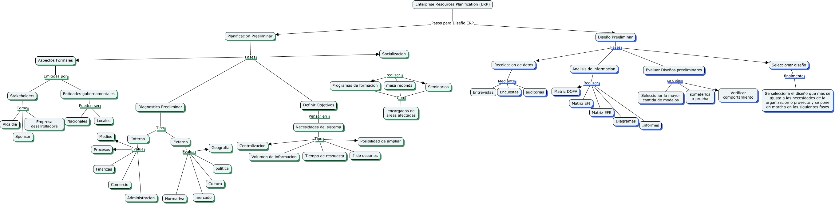 Este Cmap, tiene información relacionada con: EPR Proyectos 1, Enterprise Resources Planification (ERP) Pasos para Diseño ERP Diseño Preeliminar, Recoleccion de datos Mediante Encuestas, Necesidades del sistema Tipo Volumen de informacion, Seminarios Con encargados de areas afectadas, Entidades gubernamentales Pueden ser Nacionales, Externo Evalua Geografia, Interno Evalua Finanzas, Diseño Preeliminar Fases Recoleccion de datos, Diseño Preeliminar Fases Analisis de informacion, Stakeholders Como Alcaldia, Programas de formacion Con encargados de areas afectadas, Diagnostico Preeliminar Tipo Externo, Entidades gubernamentales Pueden ser Locales, Externo Evalua Cultura, Necesidades del sistema Tipo Posibilidad de ampliar, Evaluar Diseños preeliminares se debe Seleccionar la mayor cantida de modelos, Planificacion Preeliminar Fases Aspectos Formales, Stakeholders Como Sponsor, Recoleccion de datos Mediante auditorias, Necesidades del sistema Tipo Centralizacion