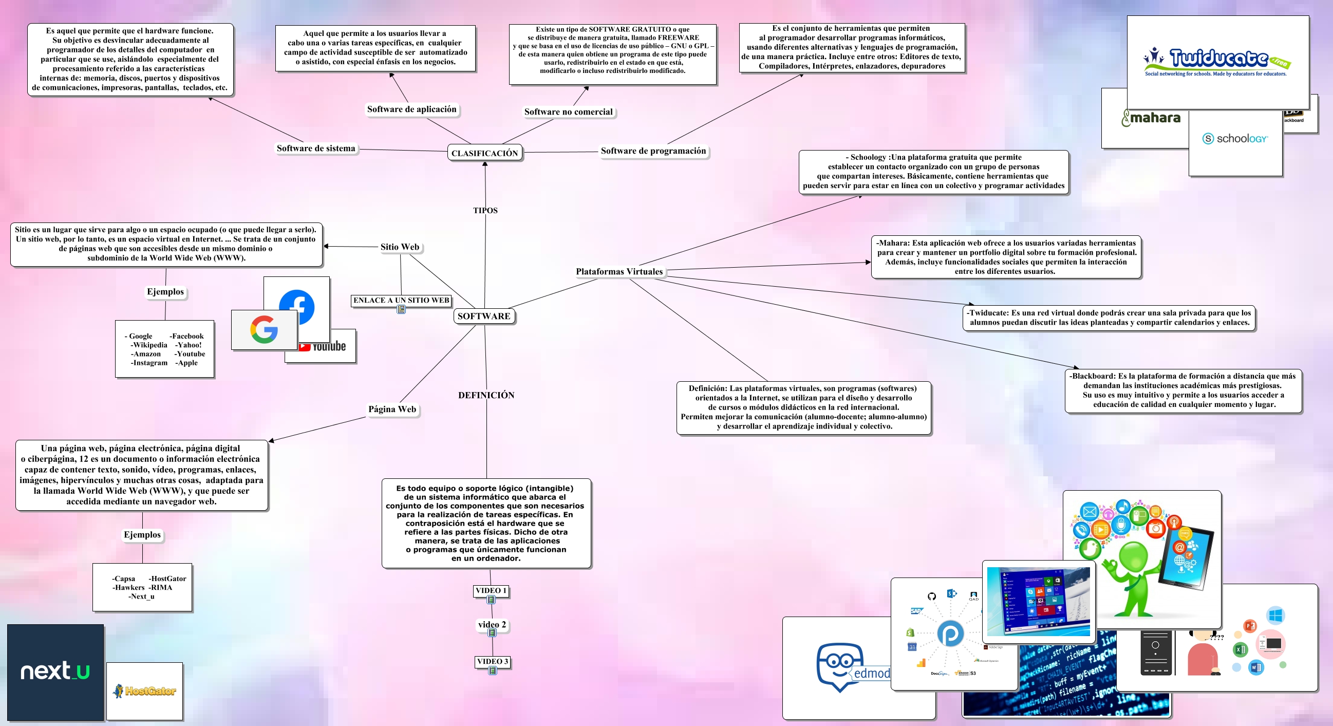 Este Cmap, tiene información relacionada con: software, Sitio es un lugar que sirve para algo o un espacio ocupado (o que puede llegar a serlo). Un sitio web, por lo tanto, es un espacio virtual en Internet. ... Se trata de un conjunto de páginas web que son accesibles desde un mismo dominio o subdominio de la World Wide Web (WWW). Ejemplos - Google -Facebook -Wikipedia -Yahoo! -Amazon -Youtube -Instagram -Apple, VIDEO 1 video 2 VIDEO 3, CLASIFICACIÓN Software de sistema Es aquel que permite que el hardware funcione. Su objetivo es desvincular adecuadamente al programador de los detalles del computador en particular que se use, aislándolo especialmente del procesamiento referido a las características internas de: memoria, discos, puertos y dispositivos de comunicaciones, impresoras, pantallas, teclados, etc., SOFTWARE Plataformas Virtuales -Mahara: Esta aplicación web ofrece a los usuarios variadas herramientas para crear y mantener un portfolio digital sobre tu formación profesional. Además, incluye funcionalidades sociales que permiten la interacción entre los diferentes usuarios., Una página web, página electrónica, página digital o ciberpágina, 12 es un documento o información electrónica capaz de contener texto, sonido, vídeo, programas, enlaces, imágenes, hipervínculos y muchas otras cosas, adaptada para la llamada World Wide Web (WWW), y que puede ser accedida mediante un navegador web. Ejemplos -Capsa -HostGator -Hawkers -RIMA -Next_u, CLASIFICACIÓN Software no comercial Existe un tipo de SOFTWARE GRATUITO o que se distribuye de manera gratuita, llamado FREEWARE y que se basa en el uso de licencias de uso público – GNU o GPL – de esta manera quien obtiene un programa de este tipo puede usarlo, redistribuirlo en el estado en que está, modificarlo o incluso redistribuirlo modificado., SOFTWARE Página Web Una página web, página electrónica, página digital o ciberpágina, 12 es un documento o información electrónica capaz de contener texto, sonido, vídeo, programas, enlaces, imágenes, hipervínculos y muchas otras cosas, adaptada para la llamada World Wide Web (WWW), y que puede ser accedida mediante un navegador web., CLASIFICACIÓN Software de aplicación Aquel que permite a los usuarios llevar a cabo una o varias tareas específicas, en cualquier campo de actividad susceptible de ser automatizado o asistido, con especial énfasis en los negocios., SOFTWARE Plataformas Virtuales Definición: Las plataformas virtuales, son programas (softwares) orientados a la Internet, se utilizan para el diseño y desarrollo de cursos o módulos didácticos en la red internacional. Permiten mejorar la comunicación (alumno-docente; alumno-alumno) y desarrollar el aprendizaje individual y colectivo., SOFTWARE Plataformas Virtuales - Schoology :Una plataforma gratuita que permite establecer un contacto organizado con un grupo de personas que compartan intereses. Básicamente, contiene herramientas que pueden servir para estar en línea con un colectivo y programar actividades, SOFTWARE TIPOS CLASIFICACIÓN, CLASIFICACIÓN Software de programación Es el conjunto de herramientas que permiten al programador desarrollar programas informáticos, usando diferentes alternativas y lenguajes de programación, de una manera práctica. Incluye entre otros: Editores de texto, Compiladores, Intérpretes, enlazadores, depuradores, SOFTWARE Sitio Web ENLACE A UN SITIO WEB, SOFTWARE Plataformas Virtuales -Blackboard: Es la plataforma de formación a distancia que más demandan las instituciones académicas más prestigiosas. Su uso es muy intuitivo y permite a los usuarios acceder a educación de calidad en cualquier momento y lugar., SOFTWARE Sitio Web Sitio es un lugar que sirve para algo o un espacio ocupado (o que puede llegar a serlo). Un sitio web, por lo tanto, es un espacio virtual en Internet. ... Se trata de un conjunto de páginas web que son accesibles desde un mismo dominio o subdominio de la World Wide Web (WWW)., SOFTWARE Plataformas Virtuales -Twiducate: Es una red virtual donde podrás crear una sala privada para que los alumnos puedan discutir las ideas planteadas y compartir calendarios y enlaces., SOFTWARE DEFINICIÓN Es todo equipo o soporte lógico (intangible) de un sistema informático que abarca el conjunto de los componentes que son necesarios para la realización de tareas específicas. En contraposición está el hardware que se refiere a las partes físicas. Dicho de otra manera, se trata de las aplicaciones o programas que únicamente funcionan en un ordenador., Es todo equipo o soporte lógico (intangible) de un sistema informático que abarca el conjunto de los componentes que son necesarios para la realización de tareas específicas. En contraposición está el hardware que se refiere a las partes físicas. Dicho de otra manera, se trata de las aplicaciones o programas que únicamente funcionan en un ordenador. ???? VIDEO 1