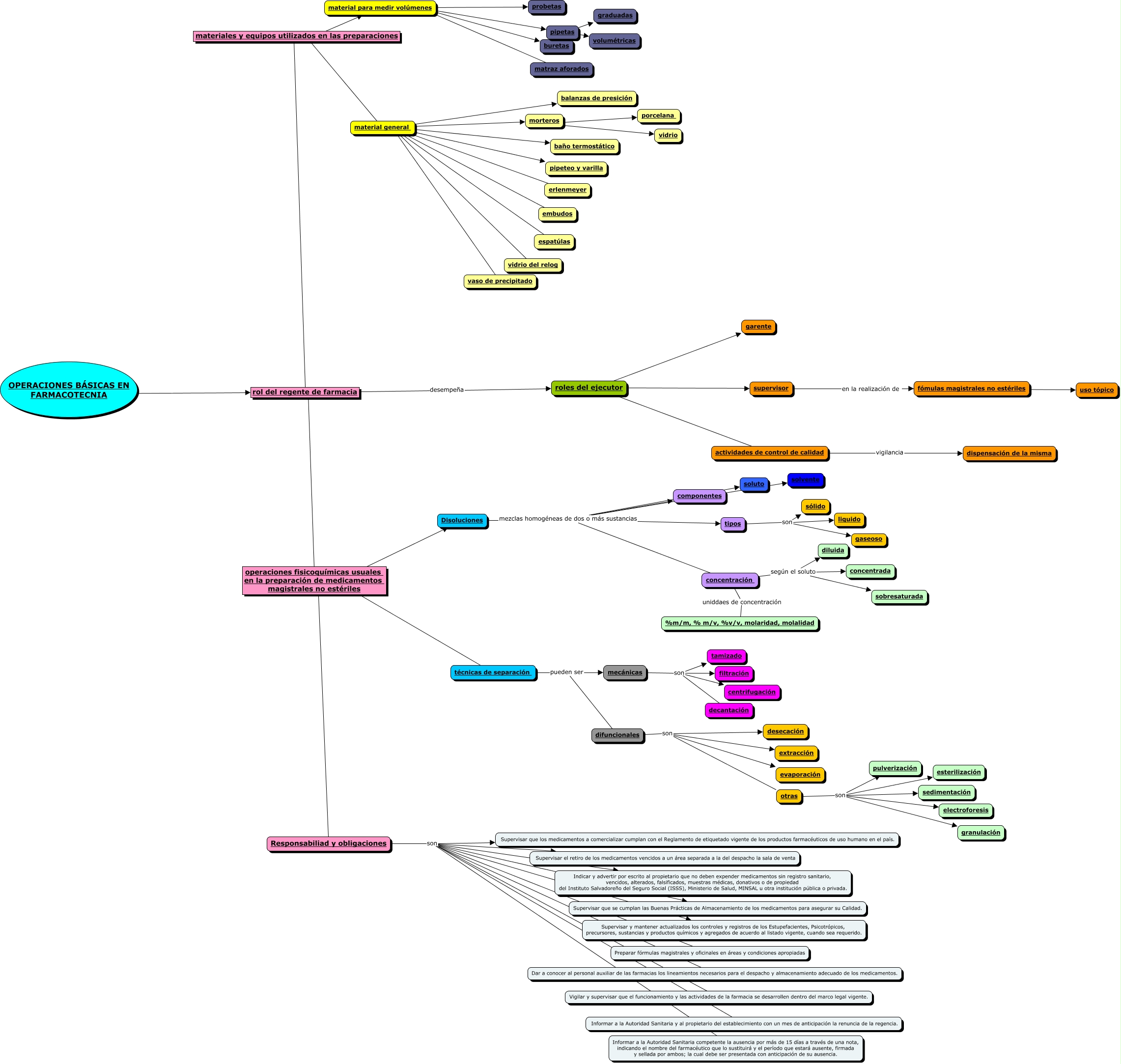 Este Cmap, tiene información relacionada con: Regencia Lina, otras son pulverización, difuncionales son desecación, pipetas ???? graduadas, Responsabiliad y obligaciones son Preparar fórmulas magistrales y oficinales en áreas y condiciones apropiadas, material general ???? morteros, Responsabiliad y obligaciones son Informar a la Autoridad Sanitaria y al propietario del establecimiento con un mes de anticipación la renuncia de la regencia., tipos son liquido, difuncionales son evaporación, Responsabiliad y obligaciones son Supervisar que se cumplan las Buenas Prácticas de Almacenamiento de los medicamentos para asegurar su Calidad., morteros ???? porcelana, mecánicas son tamizado, material general ???? espatúlas, material general ???? vaso de precipitado, materiales y equipos utilizados en las preparaciones ???? material general, material general ???? balanzas de presición, material general ???? erlenmeyer, material general ???? embudos, mecánicas son decantación, mecánicas son filtración, Responsabiliad y obligaciones son Supervisar el retiro de los medicamentos vencidos a un área separada a la del despacho la sala de venta