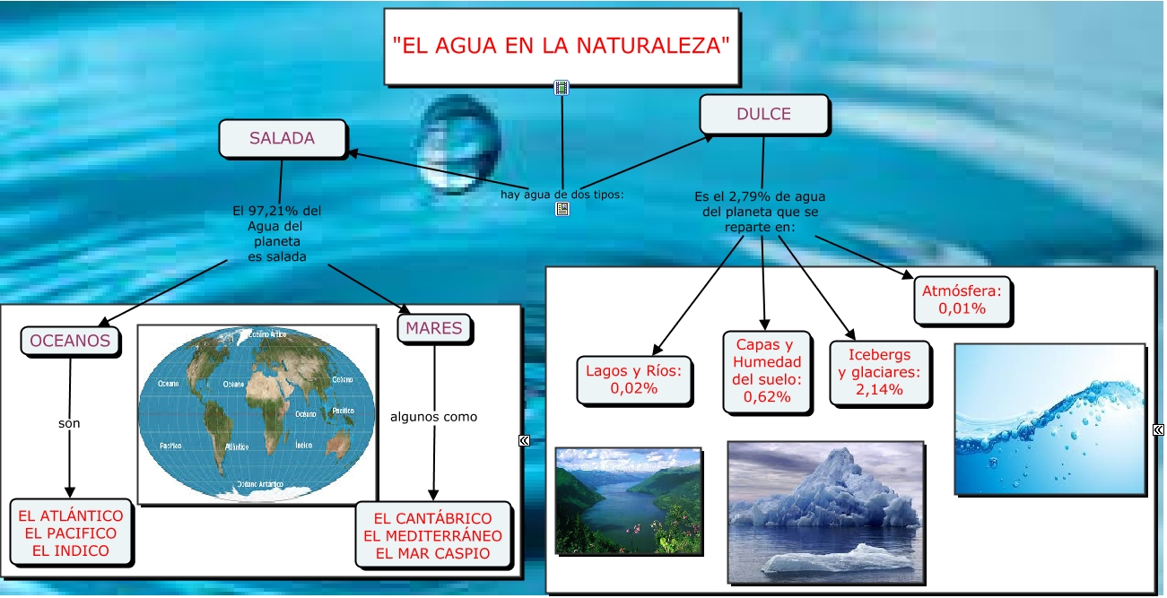 Este Cmap, tiene información relacionada con: EL AGUA EN LA N ATURALEZA, "EL AGUA EN LA NATURALEZA" hay agua de dos tipos: SALADA, SALADA El 97,21% del Agua del planeta es salada OCEANOS, MARES algunos como EL CANTÁBRICO EL MEDITERRÁNEO EL MAR CASPIO, OCEANOS son EL ATLÁNTICO EL PACIFICO EL INDICO, DULCE Es el 2,79% de agua del planeta que se reparte en: Lagos y Ríos: 0,02%, DULCE Es el 2,79% de agua del planeta que se reparte en: Atmósfera: 0,01%, "EL AGUA EN LA NATURALEZA" hay agua de dos tipos: DULCE, SALADA El 97,21% del Agua del planeta es salada MARES, DULCE Es el 2,79% de agua del planeta que se reparte en: Capas y Humedad del suelo: 0,62%, DULCE Es el 2,79% de agua del planeta que se reparte en: Icebergs y glaciares: 2,14%