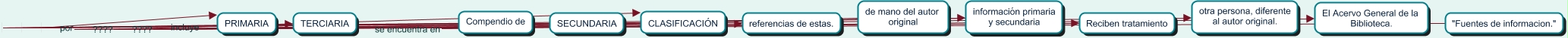 Este Cmap, tiene información relacionada con: Las fuentes de informacion, de mano del autor original se encuentra en El Acervo General de la Biblioteca., "Fuentes de informacion." ???? CLASIFICACIÓN, CLASIFICACIÓN PRIMARIA, Reciben tratamiento por otra persona, diferente al autor original., CLASIFICACIÓN TERCIARIA, Compendio de información primaria y secundaria, información primaria y secundaria incluye referencias de estas., CLASIFICACIÓN ???? Reciben tratamiento