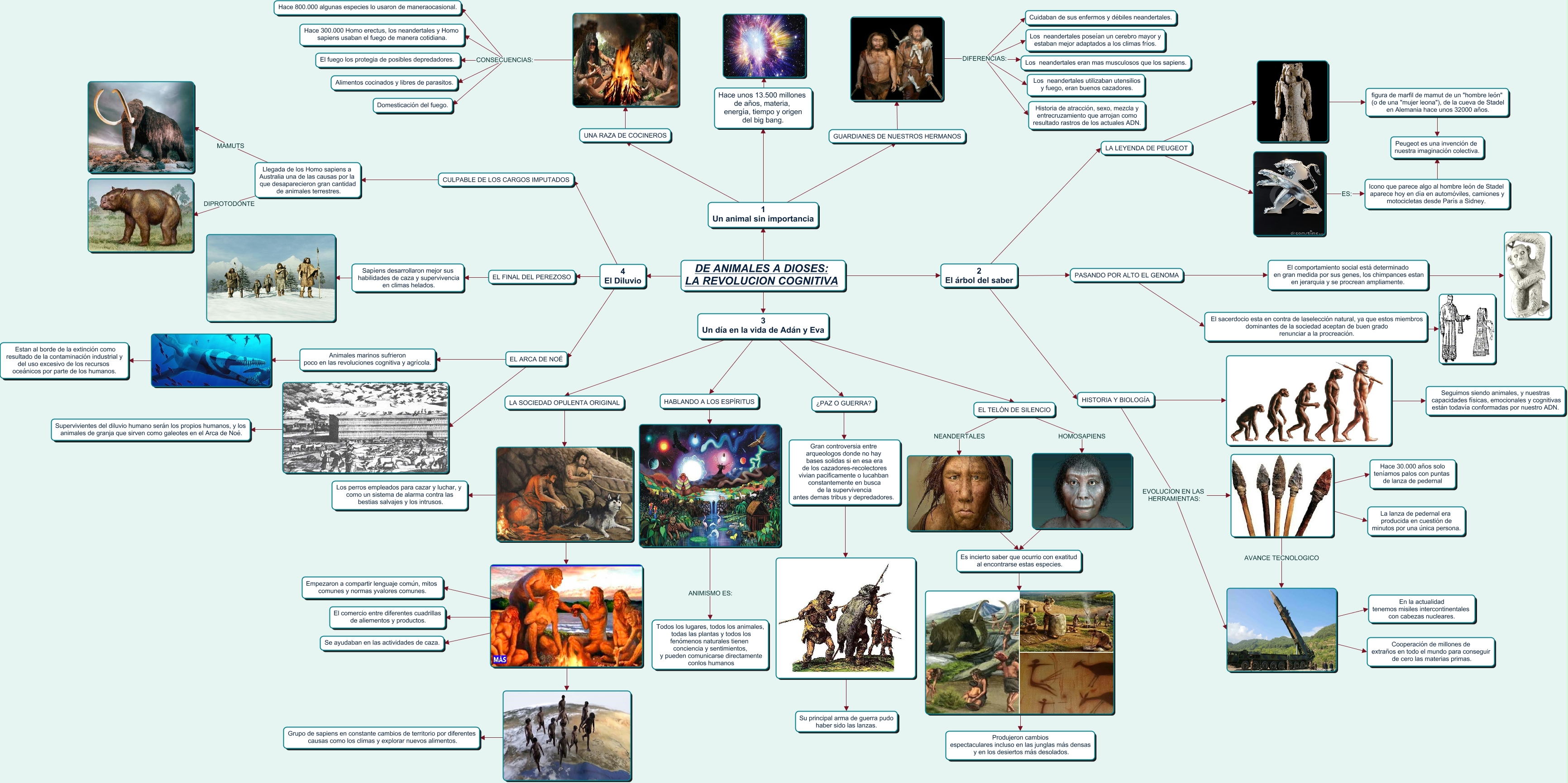 Este Cmap, tiene información relacionada con: DE ANIMALES A DIOSES, CONSECUENCIAS: Domesticación del fuego., 3 Un día en la vida de Adán y Eva EL TELÓN DE SILENCIO, ES: Icono que parece algo al hombre león de Stadel aparece hoy en día en automóviles, camiones y motocicletas desde París a Sidney., LA LEYENDA DE PEUGEOT, DE ANIMALES A DIOSES: LA REVOLUCION COGNITIVA 2 El árbol del saber, EL TELÓN DE SILENCIO NEANDERTALES, EL ARCA DE NOÉ Animales marinos sufrieron poco en las revoluciones cognitiva y agrícola., 2 El árbol del saber LA LEYENDA DE PEUGEOT, Hace 30.000 años solo teníamos palos con puntas de lanza de pedernal, DIFERENCIAS: Los neandertales poseían un cerebro mayor y estaban mejor adaptados a los climas fríos., El comportamiento social está determinado en gran medida por sus genes, los chimpances estan en jerarquia y se procrean ampliamente., UNA RAZA DE COCINEROS, 1 Un animal sin importancia GUARDIANES DE NUESTROS HERMANOS, DIFERENCIAS: Historia de atracción, sexo, mezcla y entrecruzamiento que arrojan como resultado rastros de los actuales ADN., 3 Un día en la vida de Adán y Eva LA SOCIEDAD OPULENTA ORIGINAL, 1 Un animal sin importancia Hace unos 13.500 millones de años, materia, energía, tiempo y origen del big bang., DE ANIMALES A DIOSES: LA REVOLUCION COGNITIVA 3 Un día en la vida de Adán y Eva, Produjeron cambios espectaculares incluso en las junglas más densas y en los desiertos más desolados., HISTORIA Y BIOLOGÍA EVOLUCION EN LAS HERRAMIENTAS:, figura de marfil de mamut de un "hombre león" (o de una "mujer leona"), de la cueva de Stadel en Alemania hace unos 32000 años.