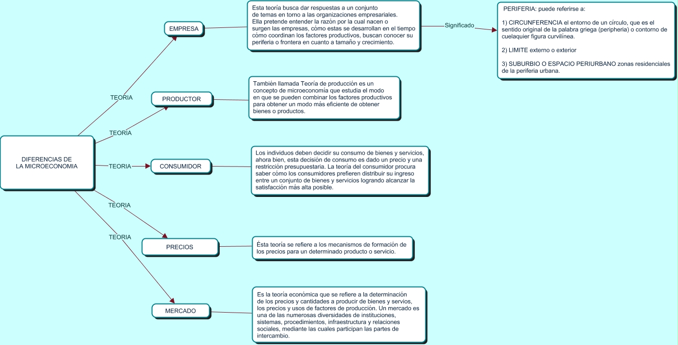 Este Cmap, tiene información relacionada con: variables economicos, DIFERENCIAS DE LA MICROECONOMIA TEORIA PRODUCTOR, DIFERENCIAS DE LA MICROECONOMIA TEORIA CONSUMIDOR, DIFERENCIAS DE LA MICROECONOMIA TEORIA MERCADO, DIFERENCIAS DE LA MICROECONOMIA TEORIA PRECIOS, CONSUMIDOR ???? Los individuos deben decidir su consumo de bienes y servicios, ahora bien, esta decisión de consumo es dado un precio y una restricción presupuestaria. La teoría del consumidor procura saber cómo los consumidores prefieren distribuir su ingreso entre un conjunto de bienes y servicios logrando alcanzar la satisfacción más alta posible., PRODUCTOR ???? También llamada Teoría de producción es un concepto de microeconomía que estudia el modo en que se pueden combinar los factores productivos para obtener un modo más eficiente de obtener bienes o productos., EMPRESA ???? Esta teoría busca dar respuestas a un conjunto de temas en torno a las organizaciones empresariales. Ella pretende entender la razón por la cual nacen o surgen las empresas, cómo estas se desarrollan en el tiempo cómo coordinan los factores productivos, buscan conocer su periferia o frontera en cuanto a tamaño y crecimiento., PRECIOS ???? Ésta teoría se refiere a los mecanismos de formación de los precios para un determinado producto o servicio., Esta teoría busca dar respuestas a un conjunto de temas en torno a las organizaciones empresariales. Ella pretende entender la razón por la cual nacen o surgen las empresas, cómo estas se desarrollan en el tiempo cómo coordinan los factores productivos, buscan conocer su periferia o frontera en cuanto a tamaño y crecimiento. Significado PERIFERIA: puede referirse a: 1) CIRCUNFERENCIA el entorno de un círculo, que es el sentido original de la palabra griega (peripheria) o contorno de cuelaquier figura curvilínea. 2) LIMITE externo o exterior 3) SUBURBIO O ESPACIO PERIURBANO zonas residenciales de la periferia urbana., MERCADO ???? Es la teoría económica que se refiere a la determinación de los precios y cantidades a producir de bienes y servios, los precios y usos de factores de producción. Un mercado es una de las numerosas diversidades de instituciones, sistemas, procedimientos, infraestructura y relaciones sociales, mediante las cuales participan las partes de intercambio., DIFERENCIAS DE LA MICROECONOMIA TEORIA EMPRESA