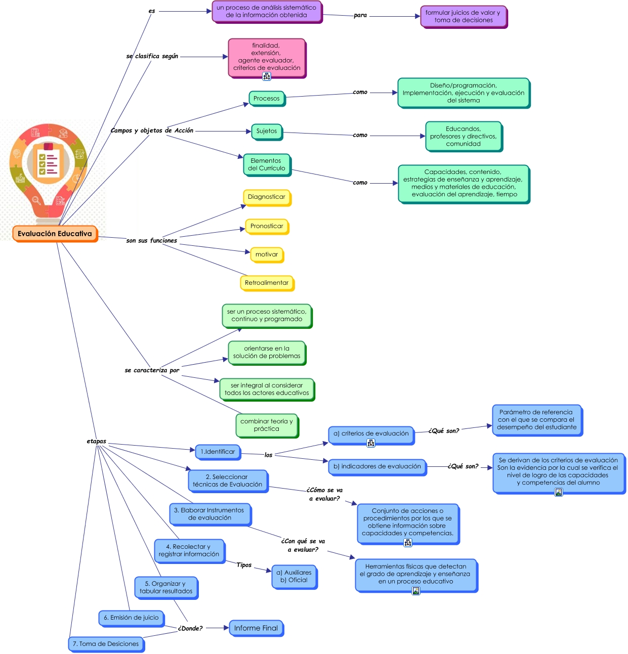Este Cmap, tiene información relacionada con: La Evaluación Educativa, Evaluación Educativa se caracteriza por ser integral al considerar todos los actores educativos, Evaluación Educativa etapas 6. Emisión de juicio, 6. Emisión de juicio ¿Donde? Informe Final, 3. Elaborar Instrumentos de evaluación ¿Con qué se va a evaluar? Herramientas físicas que detectan el grado de aprendizaje y enseñanza en un proceso educativo, Evaluación Educativa etapas 2. Seleccionar técnicas de Evaluación, 1.Identificar los a) criterios de evaluación, Evaluación Educativa Campos y objetos de Acción Sujetos, a) criterios de evaluación ¿Qué son? Parámetro de referencia con el que se compara el desempeño del estudiante, 7. Toma de Desiciones ¿Donde? Informe Final, Evaluación Educativa son sus funciones Diagnosticar, 4. Recolectar y registrar información Tipos a) Auxiliares b) Oficial, b) indicadores de evaluación ¿Qué son? Se derivan de los criterios de evaluación Son la evidencia por la cual se verifica el nivel de logro de las capacidades y competencias del alumno, Evaluación Educativa es un proceso de análisis sistemático de la información obtenida, Evaluación Educativa Campos y objetos de Acción Elementos del Currículo, Evaluación Educativa se clasifica según finalidad, extensión, agente evaluador, criterios de evaluación, Procesos como Diseño/programación, Implementación, ejecución y evaluación del sistema, Evaluación Educativa se caracteriza por orientarse en la solución de problemas, Evaluación Educativa se caracteriza por ser un proceso sistemático, continuo y programado, Evaluación Educativa son sus funciones Retroalimentar, Evaluación Educativa etapas 4. Recolectar y registrar información