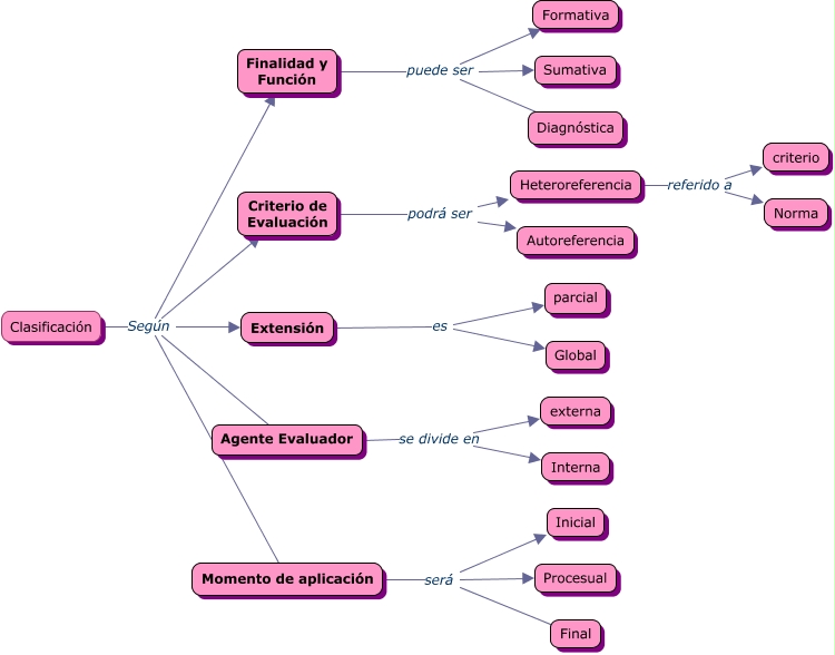 Este Cmap, tiene información relacionada con: Clasificación de la Evaluación Educativa, Heteroreferencia referido a criterio, Finalidad y Función puede ser Diagnóstica, Clasificación Según Agente Evaluador, Momento de aplicación será Final, Agente Evaluador se divide en Interna, Momento de aplicación será Procesual, Finalidad y Función puede ser Sumativa, Extensión es parcial, Criterio de Evaluación podrá ser Heteroreferencia, Momento de aplicación será Inicial, Clasificación Según Momento de aplicación, Clasificación Según Extensión, Clasificación Según Criterio de Evaluación, Finalidad y Función puede ser Formativa, Criterio de Evaluación podrá ser Autoreferencia, Heteroreferencia referido a Norma, Clasificación Según Finalidad y Función, Extensión es Global, Agente Evaluador se divide en externa