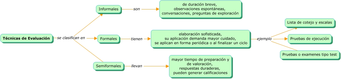 Este Cmap, tiene información relacionada con: Tecnicas de Evaluación, Técnicas de Evaluación se clasifican en Semiformales, Formales tienen elaboración sofisticada, su aplicación demanda mayor cuidado, se aplican en forma periódica o al finalizar un ciclo, Técnicas de Evaluación se clasifican en Formales, elaboración sofisticada, su aplicación demanda mayor cuidado, se aplican en forma periódica o al finalizar un ciclo ejemplo Pruebas de ejecución, Informales son de duración breve, observaciones espontáneas, conversaciones, preguntas de exploración, Técnicas de Evaluación se clasifican en Informales, Semiformales llevan mayor tiempo de preparación y de valoración, respuestas duraderas, pueden generar calificaciones, elaboración sofisticada, su aplicación demanda mayor cuidado, se aplican en forma periódica o al finalizar un ciclo ejemplo Lista de cotejo y escalas, elaboración sofisticada, su aplicación demanda mayor cuidado, se aplican en forma periódica o al finalizar un ciclo ejemplo Pruebas o examenes tipo test