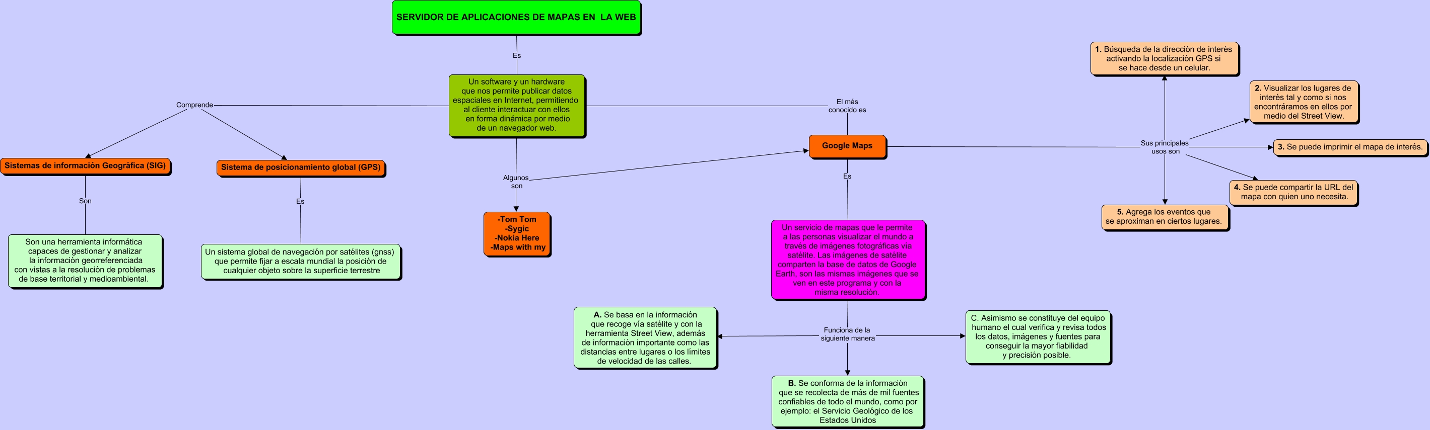 Este Cmap, tiene información relacionada con: Estudios Sociales 1, Un software y un hardware que nos permite publicar datos espaciales en Internet, permitiendo al cliente interactuar con ellos en forma dinámica por medio de un navegador web. Algunos son -Tom Tom -Sygic -Nokia Here -Maps with my, Google Maps Sus principales usos son 1. Búsqueda de la dirección de interés activando la localización GPS si se hace desde un celular., Google Maps Sus principales usos son 4. Se puede compartir la URL del mapa con quien uno necesita., Google Maps Es Un servicio de mapas que le permite a las personas visualizar el mundo a través de imágenes fotográficas vía satélite. Las imágenes de satélite comparten la base de datos de Google Earth, son las mismas imágenes que se ven en este programa y con la misma resolución., Google Maps Sus principales usos son 3. Se puede imprimir el mapa de interés., Sistemas de información Geográfica (SIG) Son Son una herramienta informática capaces de gestionar y analizar la información georreferenciada con vistas a la resolución de problemas de base territorial y medioambiental., Un software y un hardware que nos permite publicar datos espaciales en Internet, permitiendo al cliente interactuar con ellos en forma dinámica por medio de un navegador web. Comprende Sistema de posicionamiento global (GPS), Sistema de posicionamiento global (GPS) Es Un sistema global de navegación por satélites (gnss) que permite fijar a escala mundial la posición de cualquier objeto sobre la superficie terrestre, SERVIDOR DE APLICACIONES DE MAPAS EN LA WEB Es Un software y un hardware que nos permite publicar datos espaciales en Internet, permitiendo al cliente interactuar con ellos en forma dinámica por medio de un navegador web., Un servicio de mapas que le permite a las personas visualizar el mundo a través de imágenes fotográficas vía satélite. Las imágenes de satélite comparten la base de datos de Google Earth, son las mismas imágenes que se ven en este programa y con la misma resolución. Funciona de la siguiente manera C. Asimismo se constituye del equipo humano el cual verifica y revisa todos los datos, imágenes y fuentes para conseguir la mayor fiabilidad y precisión posible., Un software y un hardware que nos permite publicar datos espaciales en Internet, permitiendo al cliente interactuar con ellos en forma dinámica por medio de un navegador web. Algunos son Google Maps, Google Maps Sus principales usos son 2. Visualizar los lugares de interés tal y como si nos encontráramos en ellos por medio del Street View., Un servicio de mapas que le permite a las personas visualizar el mundo a través de imágenes fotográficas vía satélite. Las imágenes de satélite comparten la base de datos de Google Earth, son las mismas imágenes que se ven en este programa y con la misma resolución. Funciona de la siguiente manera A. Se basa en la información que recoge vía satélite y con la herramienta Street View, además de información importante como las distancias entre lugares o los límites de velocidad de las calles., Un software y un hardware que nos permite publicar datos espaciales en Internet, permitiendo al cliente interactuar con ellos en forma dinámica por medio de un navegador web. El más conocido es Google Maps, Un software y un hardware que nos permite publicar datos espaciales en Internet, permitiendo al cliente interactuar con ellos en forma dinámica por medio de un navegador web. Comprende Sistemas de información Geográfica (SIG), Google Maps Sus principales usos son 5. Agrega los eventos que se aproximan en ciertos lugares., Un servicio de mapas que le permite a las personas visualizar el mundo a través de imágenes fotográficas vía satélite. Las imágenes de satélite comparten la base de datos de Google Earth, son las mismas imágenes que se ven en este programa y con la misma resolución. Funciona de la siguiente manera B. Se conforma de la información que se recolecta de más de mil fuentes confiables de todo el mundo, como por ejemplo: el Servicio Geológico de los Estados Unidos