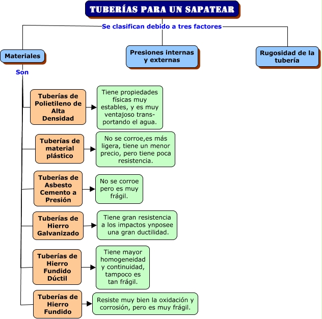 Este Cmap, tiene información relacionada con: Mapa 2 de Abastecimiento de Agua y Alcantarillado - ESC. N°7, Tuberías para un SAPATEAR Se clasifican debido a tres factores Materiales, Tuberías para un SAPATEAR Se clasifican debido a tres factores Rugosidad de la tubería, Tuberías de Hierro Galvanizado Tiene gran resistencia a los impactos ynposee una gran ductilidad., Materiales Son Tuberías de Hierro Fundido, Materiales Son Tuberías de Hierro Fundido Dúctil, Tuberías de Hierro Fundido Dúctil Tiene mayor homogeneidad y continuidad, tampoco es tan frágil., Tuberías de Asbesto Cemento a Presión No se corroe pero es muy frágil., Tuberías de Polietileno de Alta Densidad Tiene propiedades físicas muy estables, y es muy ventajoso trans- portando el agua., Materiales Son Tuberías de Asbesto Cemento a Presión, Tuberías de material plástico No se corroe,es más ligera, tiene un menor precio, pero tiene poca resistencia., Tuberías de Hierro Fundido Resiste muy bien la oxidación y corrosión, pero es muy frágil., Materiales Son Tuberías de Hierro Galvanizado, Tuberías para un SAPATEAR Se clasifican debido a tres factores Presiones internas y externas, Materiales Son Tuberías de material plástico, Materiales Son Tuberías de Polietileno de Alta Densidad