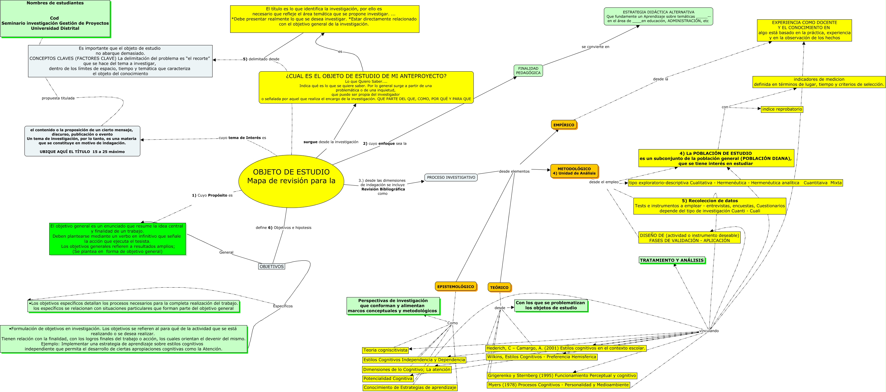 Este Cmap, tiene información relacionada con: SEMINARIO DE INVESTIGACIÓN.cmap, PROCESO INVESTIGATIVO desde elementos TEÓRICO, TEÓRICO desde Myers (1978) Procesos Cognitivos - Personalidad y Medioambiente, EPISTEMOLÓGICO Como Teoria cogniscitivista, OBJETIVOS Especificos • Los objetivos específicos detallan los procesos necesarios para la completa realización del trabajo. los específicos se relacionan con situaciones particulares que forman parte del objetivo general, EPISTEMOLÓGICO Como Dimensiones de lo Cognitivo; La atención, PROCESO INVESTIGATIVO desde elementos EPISTEMOLÓGICO, OBJETO DE ESTUDIO Mapa de revisión para la define 6) Objetivos e hipotesis OBJETIVOS, EMPÍRICO desde la EXPERIENCIA COMO DOCENTE Y EL CONOCIMIENTO EN algo está basado en la práctica, experiencia y en la observación de los hechos, EPISTEMOLÓGICO Como Conocimiento de Estrategias de aprendizaje, TEÓRICO desde Hederich, C – Camargo, A. (2001) Estilos cognitivos en el contexto escolar., OBJETO DE ESTUDIO Mapa de revisión para la 3.) desde las dimensiones de indagación se incluye Revisión Bibliográfica como PROCESO INVESTIGATIVO, Conocimiento de Estrategias de aprendizaje vinculando Estilos Cognitivos Independencia y Dependencia, OBJETO DE ESTUDIO Mapa de revisión para la 5) delimitado desde Es importante que el objeto de estudio no abarque demasiado. CONCEPTOS CLAVES (FACTORES CLAVE) La delimitación del problema es “el recorte” que se hace del tema a investigar, dentro de los límites de espacio, tiempo y temática que caracteriza el objeto del conocimiento, OBJETIVOS Especificos •Formulación de objetivos en investigación. Los objetivos se refieren al para qué de la actividad que se está realizando o se desea realizar. Tienen relación con la finalidad, con los logros finales del trabajo o acción, los cuales orientan el devenir del mismo. Ejemplo: Implementar una estrategia de aprendizaje sobre estilos cognitivos independiente que permita el desarrollo de ciertas apropiaciones cognitivas como la Atención., TEÓRICO desde Wilkins, Estilos Cognitivos - Preferencia Hemisferica, METODOLÓGICO 4) Unidad de Análisis desde el empleo DISEÑO DE (actividad o instrumento deseable) FASES DE VALIDACIÓN - APLICACIÓN, Conocimiento de Estrategias de aprendizaje vinculando Wilkins, Estilos Cognitivos - Preferencia Hemisferica, Conocimiento de Estrategias de aprendizaje vinculando 4) La POBLACIÓN DE ESTUDIO es un subconjunto de la población general (POBLACIÓN DIANA), que se tiene interés en estudiar, Conocimiento de Estrategias de aprendizaje vinculando DISEÑO DE (actividad o instrumento deseable) FASES DE VALIDACIÓN - APLICACIÓN, TEÓRICO desde Grigerenko y Sternberg (1995) Funcionamiento Perceptual y cognitivo
