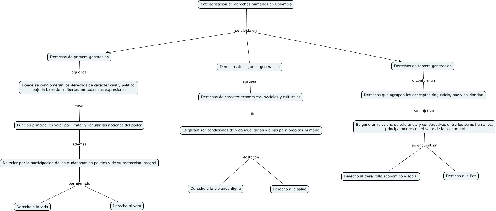 Este Cmap, tiene información relacionada con: Derechos, Es garantizar condiciones de vida igualitarias y dinas para todo ser humano destacan Derecho a la vivienda digna, Derechos de segunda generacion agrupan Derechos de caracter economicos, sociales y culturales, Es garantizar condiciones de vida igualitarias y dinas para todo ser humano destacan Derecho a la salud, Derechos de caracter economicos, sociales y culturales su fin Es garantizar condiciones de vida igualitarias y dinas para todo ser humano, Funcion principal es velar por limitar y regular las acciones del poder ademas De velar por la participacion de los ciudadanos en politica y de su proteccion integral, Categorizacion de derechos humanos en Colombia se divide en Derechos de primera generacion, De velar por la participacion de los ciudadanos en politica y de su proteccion integral por ejemplo Derecho al voto, Donde se conglomeran los derechos de caracter civil y politico, bajo la base de la libertad en todas sus expresiones cuya Funcion principal es velar por limitar y regular las acciones del poder, Derechos que agrupan los conceptos de justicia, paz y solidaridad su objetivo Es generar relacions de tolerancia y constructivas entre los seres humanos, principalmente con el valor de la solidaridad, Es generar relacions de tolerancia y constructivas entre los seres humanos, principalmente con el valor de la solidaridad se encuentran Derecho al desarrollo economico y social, Categorizacion de derechos humanos en Colombia se divide en Derechos de tercera generacion, Derechos de primera generacion aquellos Donde se conglomeran los derechos de caracter civil y politico, bajo la base de la libertad en todas sus expresiones, Derechos de tercera generacion lo conforman Derechos que agrupan los conceptos de justicia, paz y solidaridad, De velar por la participacion de los ciudadanos en politica y de su proteccion integral por ejemplo Derecho a la vida, Es generar relacions de tolerancia y constructivas entre los seres humanos, principalmente con el valor de la solidaridad se encuentran Derecho a la Paz, Categorizacion de derechos humanos en Colombia se divide en Derechos de segunda generacion