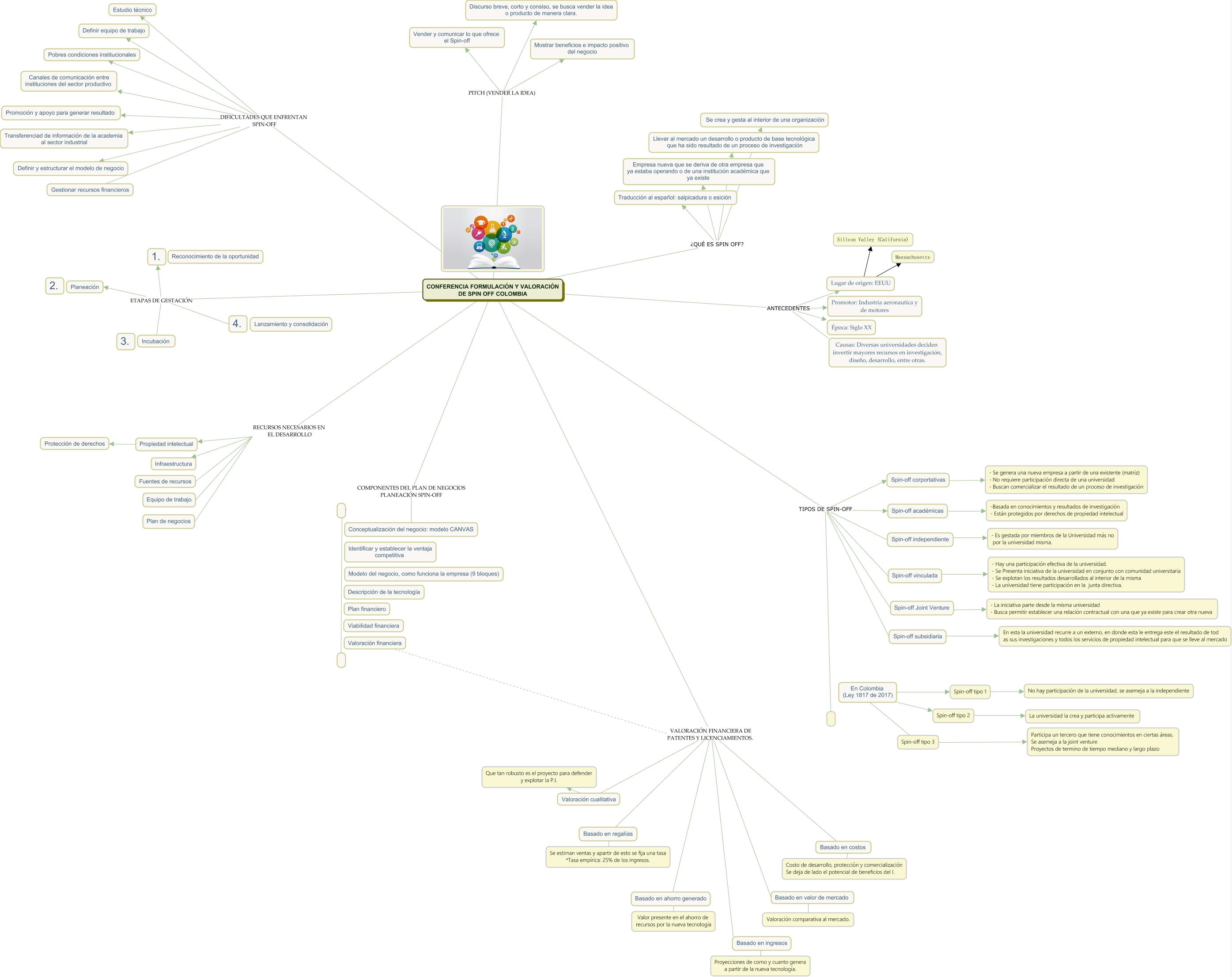 Este Cmap, tiene información relacionada con: rev2222, CONFERENCIA FORMULACIÓN Y VALORACIÓN DE SPIN OFF COLOMBIA ¿QUÉ ES SPIN OFF? Llevar al mercado un desarrollo o producto de base tecnológica que ha sido resultado de un proceso de investigación, CONFERENCIA FORMULACIÓN Y VALORACIÓN DE SPIN OFF COLOMBIA ¿QUÉ ES SPIN OFF? Traducción al español: salpicadura o esición, CONFERENCIA FORMULACIÓN Y VALORACIÓN DE SPIN OFF COLOMBIA VALORACIÓN FINANCIERA DE PATENTES Y LICENCIAMIENTOS. Basado en ingresos, Basado en regalías ???? Se estiman ventas y apartir de esto se fija una tasa *Tasa empírica: 25% de los ingresos., CONFERENCIA FORMULACIÓN Y VALORACIÓN DE SPIN OFF COLOMBIA TIPOS DE SPIN-OFF Spin-off corportativas, CONFERENCIA FORMULACIÓN Y VALORACIÓN DE SPIN OFF COLOMBIA RECURSOS NECESARIOS EN EL DESARROLLO Plan de negocios, Spin-off tipo 2 ???? La universidad la crea y participa activamente, CONFERENCIA FORMULACIÓN Y VALORACIÓN DE SPIN OFF COLOMBIA DIFICULTADES QUE ENFRENTAN SPIN-OFF Canales de comunicación entre instituciones del sector productivo, En Colombia (Ley 1817 de 2017) ???? Spin-off tipo 3, Lugar de origen: EEUU ???? Silicon Valley (California), CONFERENCIA FORMULACIÓN Y VALORACIÓN DE SPIN OFF COLOMBIA RECURSOS NECESARIOS EN EL DESARROLLO Infraestructura, Basado en ingresos ???? Proyecciones de como y cuanto genera a partir de la nueva tecnología., Spin-off vinculada ???? - Hay una participación efectiva de la universidad. - Se Presenta iniciativa de la universidad en conjunto con comunidad universitaria - Se explotan los resultados desarrollados al interior de la misma - La universidad tiene participación en la junta directiva., CONFERENCIA FORMULACIÓN Y VALORACIÓN DE SPIN OFF COLOMBIA VALORACIÓN FINANCIERA DE PATENTES Y LICENCIAMIENTOS. Basado en costos, CONFERENCIA FORMULACIÓN Y VALORACIÓN DE SPIN OFF COLOMBIA TIPOS DE SPIN-OFF Spin-off vinculada, Valoración financiera VALORACIÓN FINANCIERA DE PATENTES Y LICENCIAMIENTOS. Basado en valor de mercado, En Colombia (Ley 1817 de 2017) ???? Spin-off tipo 2, CONFERENCIA FORMULACIÓN Y VALORACIÓN DE SPIN OFF COLOMBIA ETAPAS DE GESTACIÓN Planeación, Spin-off subsidiaria ???? En esta la universidad recurre a un externo, en donde esta le entrega este el resultado de tod as sus investigaciones y todos los servicios de propiedad intelectual para que se lleve al mercado, CONFERENCIA FORMULACIÓN Y VALORACIÓN DE SPIN OFF COLOMBIA PITCH (VENDER LA IDEA) Vender y comunicar lo que ofrece el Spin-off