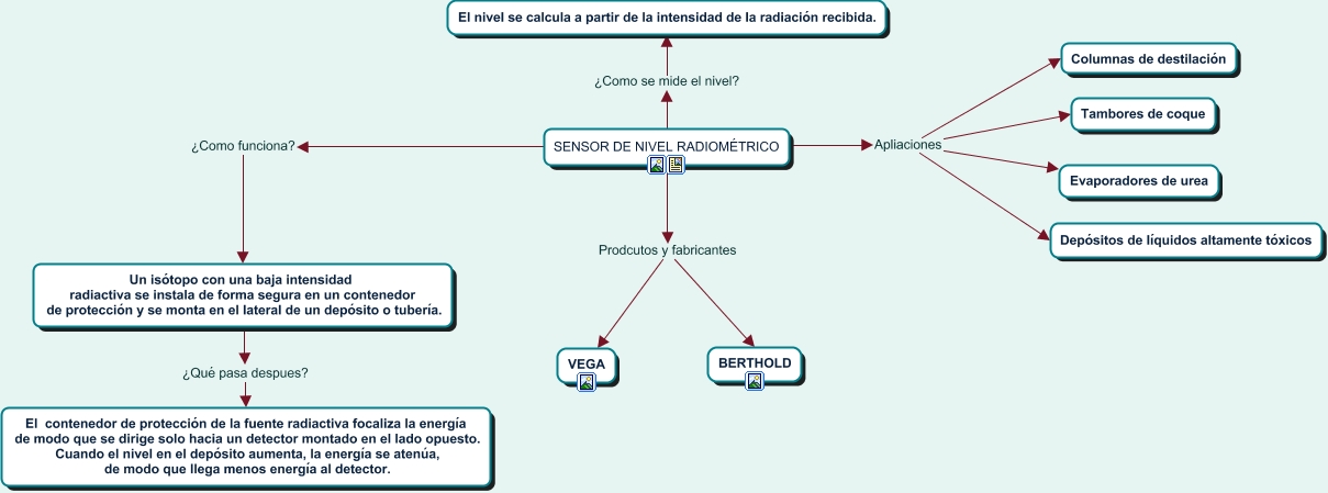 Este Cmap, tiene información relacionada con: Sensores de nivel radiométrico, SENSOR DE NIVEL RADIOMÉTRICO ¿Como se mide el nivel? El nivel se calcula a partir de la intensidad de la radiación recibida., SENSOR DE NIVEL RADIOMÉTRICO ¿Como funciona? Un isótopo con una baja intensidad radiactiva se instala de forma segura en un contenedor de protección y se monta en el lateral de un depósito o tubería., SENSOR DE NIVEL RADIOMÉTRICO Apliaciones Columnas de destilación, SENSOR DE NIVEL RADIOMÉTRICO Apliaciones Evaporadores de urea, SENSOR DE NIVEL RADIOMÉTRICO Apliaciones Tambores de coque, SENSOR DE NIVEL RADIOMÉTRICO Prodcutos y fabricantes VEGA, SENSOR DE NIVEL RADIOMÉTRICO Apliaciones Depósitos de líquidos altamente tóxicos, Un isótopo con una baja intensidad radiactiva se instala de forma segura en un contenedor de protección y se monta en el lateral de un depósito o tubería. ¿Qué pasa despues? El contenedor de protección de la fuente radiactiva focaliza la energía de modo que se dirige solo hacia un detector montado en el lado opuesto. Cuando el nivel en el depósito aumenta, la energía se atenúa, de modo que llega menos energía al detector., SENSOR DE NIVEL RADIOMÉTRICO Prodcutos y fabricantes BERTHOLD