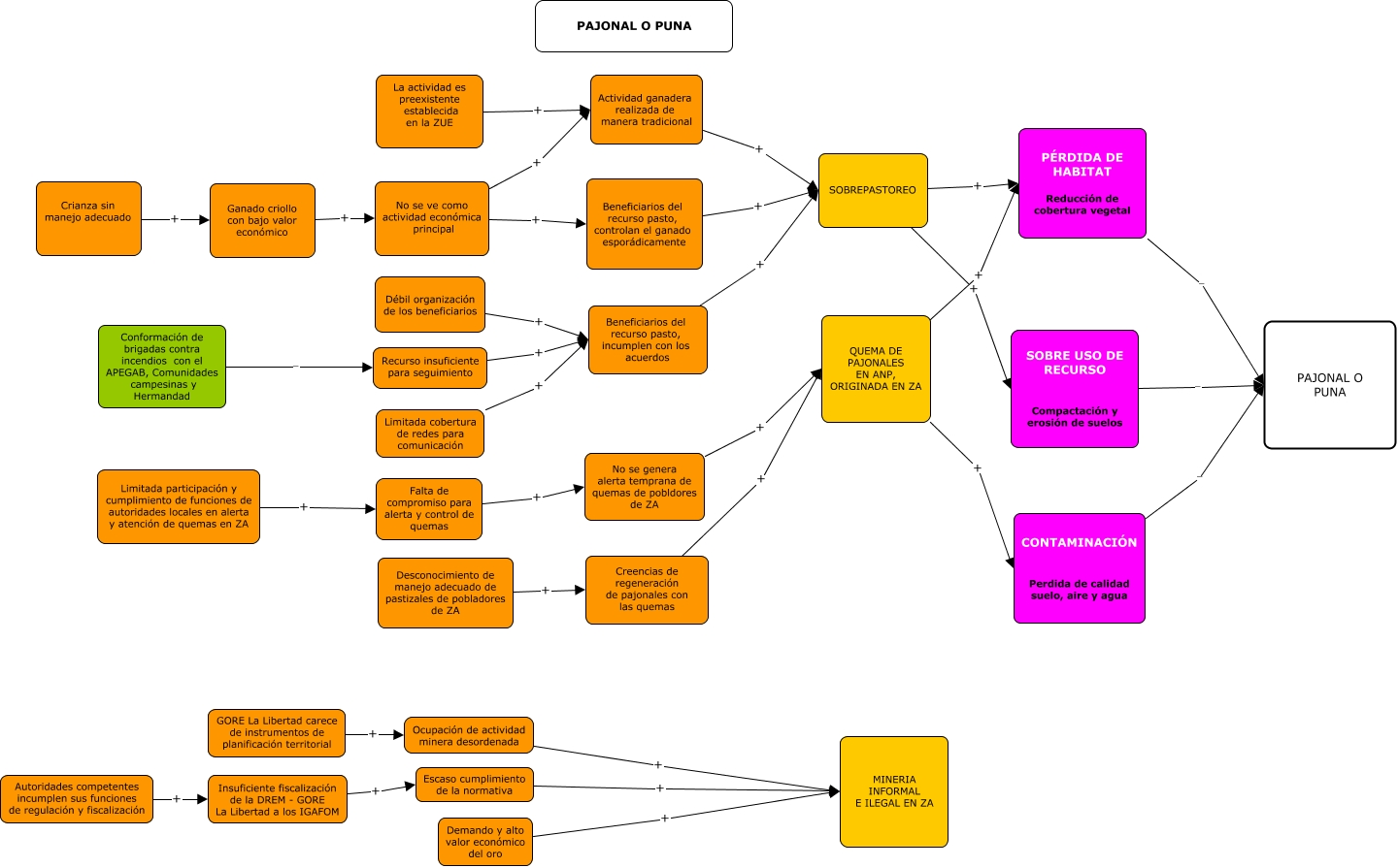 This Concept Map, created with IHMC CmapTools, has information related to: PAJONAL O PUNA, GORE La Libertad carece de instrumentos de planificación territorial + Ocupación de actividad minera desordenada, SOBREPASTOREO + PÉRDIDA DE HABITAT Reducción de cobertura vegetal, No se genera alerta temprana de quemas de pobldores de ZA + QUEMA DE PAJONALES EN ANP, ORIGINADA EN ZA, Crianza sin manejo adecuado + Ganado criollo con bajo valor económico, PÉRDIDA DE HABITAT Reducción de cobertura vegetal - PAJONAL O PUNA, QUEMA DE PAJONALES EN ANP, ORIGINADA EN ZA + PÉRDIDA DE HABITAT Reducción de cobertura vegetal, Insuficiente fiscalización de la DREM - GORE La Libertad a los IGAFOM + Escaso cumplimiento de la normativa, Ocupación de actividad minera desordenada + MINERIA INFORMAL E ILEGAL EN ZA, CONTAMINACIÓN Perdida de calidad suelo, aire y agua - PAJONAL O PUNA, Actividad ganadera realizada de manera tradicional + SOBREPASTOREO, Ganado criollo con bajo valor económico + No se ve como actividad económica principal, Creencias de regeneración de pajonales con las quemas + QUEMA DE PAJONALES EN ANP, ORIGINADA EN ZA, Escaso cumplimiento de la normativa + MINERIA INFORMAL E ILEGAL EN ZA, SOBRE USO DE RECURSO Compactación y erosión de suelos - PAJONAL O PUNA, Beneficiarios del recurso pasto, controlan el ganado esporádicamente + SOBREPASTOREO, Autoridades competentes incumplen sus funciones de regulación y fiscalización + Insuficiente fiscalización de la DREM - GORE La Libertad a los IGAFOM, Falta de compromiso para alerta y control de quemas + No se genera alerta temprana de quemas de pobldores de ZA, La actividad es preexistente establecida en la ZUE + Actividad ganadera realizada de manera tradicional, Débil organización de los beneficiarios + Beneficiarios del recurso pasto, incumplen con los acuerdos, Desconocimiento de manejo adecuado de pastizales de pobladores de ZA + Creencias de regeneración de pajonales con las quemas