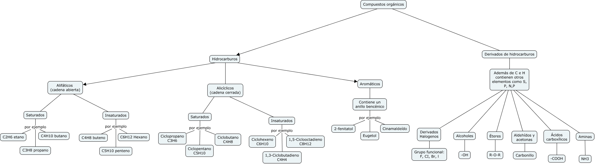 Este Cmap, tiene información relacionada con: Compuestos orgánicos, Además de C e H contienen otros elementos como S, P, N,P ???? Derivados Halogenos, Derivados de hidrocarburos ???? Además de C e H contienen otros elementos como S, P, N,P, Aldehídos y acetonas ???? Carbonillo, Hidrocarburos ???? Alicíclicos (cadena cerrada), Saturados por ejemplo C3H8 propano, Además de C e H contienen otros elementos como S, P, N,P ???? Éteres, Saturados por ejemplo Ciclobutano C4H8, Aminas ???? NH3, Insaturados por ejemplo C4H8 buteno, Alifáticos (cadena abierta) ???? Saturados, Contiene un anillo bencénico por ejemplo 2-fenitatol, Alifáticos (cadena abierta) ???? Insaturados, Insaturados por ejemplo 1,3-Ciclobutadieno C4H4, Saturados por ejemplo C2H6 etano, Hidrocarburos ???? Alifáticos (cadena abierta), Contiene un anillo bencénico por ejemplo Eugetol, Insaturados por ejemplo C6H12 Hexano, Ácidos carboxílicos ???? -COOH, Saturados por ejemplo Ciclopropano C3H6, Insaturados por ejemplo Ciclohexeno C6H10