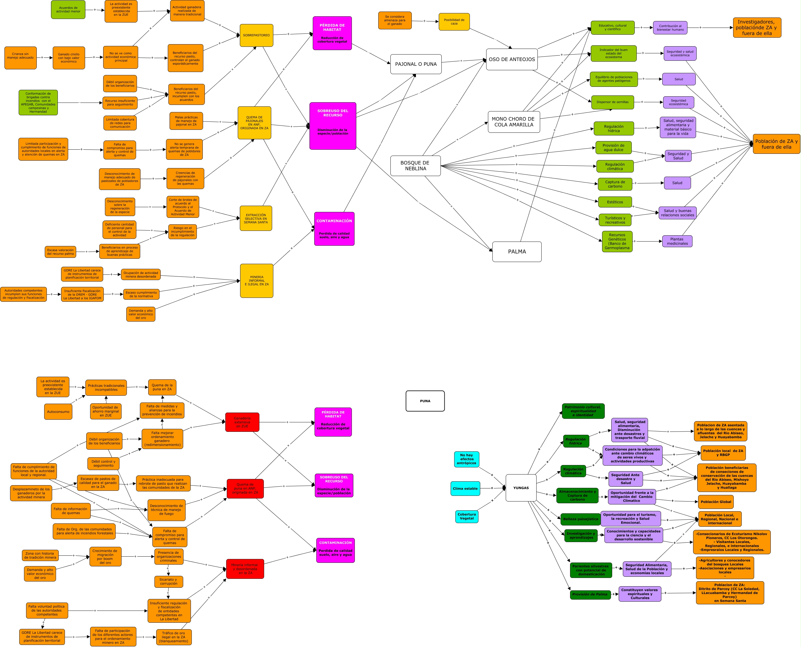 Este Cmap, tiene información relacionada con: MAPA CONCEPTUAL_CONSOLIDADO 1_IORE, Seguridad Ante desastre y Salud + Población local de ZA y RBGP, Equilibrio de poblaciones de agentes patógenos + Salud, Falta de información de quemas + Falta de compromiso para alerta y control de quemas, Falta de participaciòn de los diferentes actores para el ordenamiento minero en ZA + Tráfico de oro ilegal en la ZA (blanqueamiento), Insuficiente fiscalización de la DREM - GORE La Libertad a los IGAFOM + Escaso cumplimiento de la normativa, Falta mejorar ordenamiento ganadero (redimensionamiento) + Falta de medidas y alianzas para la prevención de incendios, PALMA + Educativo, cultural y científico, SOBREPASTOREO + SOBREUSO DEL RECURSO Disminución de la especie/población, Oportunidad para el turismo, la recreación y Salud Emocional. + Población Local, Regional, Nacional e internacional, Ganado criollo con bajo valor económico + No se ve como actividad económica principal, Quema de la puna en ZA + Ganadería extensiva en ZUE, Presencia de organizaciones criminales + Minería informal y desordenada en la ZA, Seguridad Ante desastre y Salud + Población beneficiarias de conseciones de conservación de las cuencas del Rio Abiseo, Mishoyo Jelache, Huayabamba y Huallaga, BOSQUE DE NEBLINA + Regulación hídrica, BOSQUE DE NEBLINA + PALMA, YUNGAS + Patrimonio cultural, espiritualidad e identidad, Conocimientos y capacidades para la ciencia y el desarrollo sostenible + Población Local, Regional, Nacional e internacional, Limitada participación y cumplimiento de funciones de autoridades locales en alerta y atención de quemas en ZA + Falta de compromiso para alerta y control de quemas, Acuerdos de actividad menor + La actividad es preexistente establecida en la ZUE, Cobertura Vegetal + YUNGAS