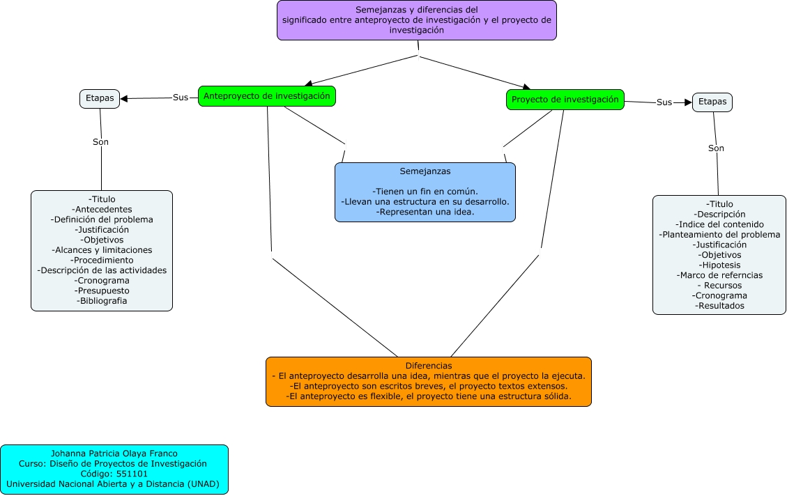 Este Cmap, tiene información relacionada con: Semejanzas y diferencias, Semejanzas y diferencias del significado entre anteproyecto de investigación y el proyecto de investigación Anteproyecto de investigación, Etapas Son -Titulo -Antecedentes -Definición del problema -Justificación -Objetivos -Alcances y limitaciones -Procedimiento -Descripción de las actividades -Cronograma -Presupuesto -Bibliografia, Proyecto de investigación Diferencias - El anteproyecto desarrolla una idea, mientras que el proyecto la ejecuta. -El anteproyecto son escritos breves, el proyecto textos extensos. -El anteproyecto es flexible, el proyecto tiene una estructura sólida., Anteproyecto de investigación Semejanzas -Tienen un fin en común. -Llevan una estructura en su desarrollo. -Representan una idea., Proyecto de investigación Sus Etapas, Anteproyecto de investigación Sus Etapas, Etapas Son -Titulo -Descripción -Indice del contenido -Planteamiento del problema -Justificación -Objetivos -Hipotesis -Marco de referncias - Recursos -Cronograma -Resultados, Proyecto de investigación Semejanzas -Tienen un fin en común. -Llevan una estructura en su desarrollo. -Representan una idea., Semejanzas y diferencias del significado entre anteproyecto de investigación y el proyecto de investigación Proyecto de investigación, Anteproyecto de investigación ????