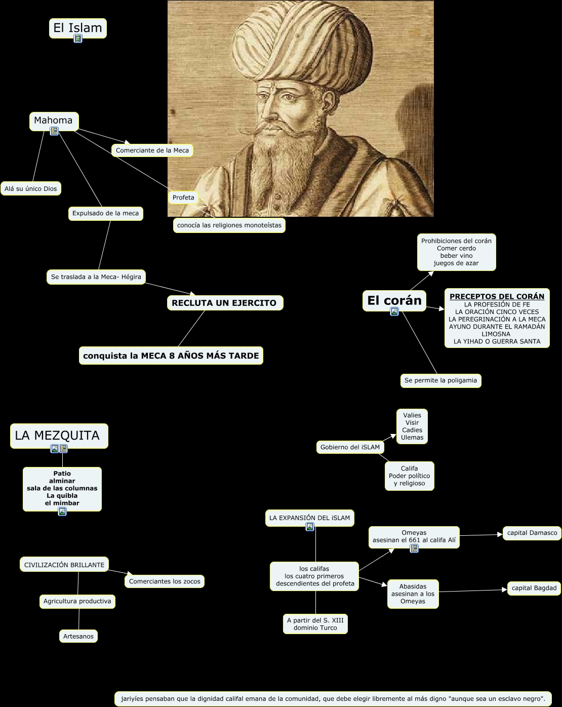 Este Cmap, tiene información relacionada con: el Islam, El corán ???? PRECEPTOS DEL CORÁN LA PROFESIÓN DE FE LA ORACIÓN CINCO VECES LA PEREGRINACIÓN A LA MECA AYUNO DURANTE EL RAMADÁN LIMOSNA LA YIHAD O GUERRA SANTA, Omeyas asesinan el 661 al califa Alí ???? capital Damasco, Profeta ???? conocía las religiones monoteístas, CIVILIZACIÓN BRILLANTE ???? Agricultura productiva, CIVILIZACIÓN BRILLANTE ???? Comerciantes los zocos, Mahoma ???? Expulsado de la meca, Abasidas asesinan a los Omeyas ???? capital Bagdad, Mahoma ???? Profeta, Mahoma ???? Comerciante de la Meca, los califas los cuatro primeros descendientes del profeta ???? Omeyas asesinan el 661 al califa Alí, Expulsado de la meca ???? Se traslada a la Meca- Hégira, LA MEZQUITA ???? Patio alminar sala de las columnas La quibla el mimbar, Gobierno del iSLAM ???? Califa Poder político y religioso, LA EXPANSIÓN DEL iSLAM A partir del S. XIII dominio Turco, RECLUTA UN EJERCITO ???? conquista la MECA 8 AÑOS MÁS TARDE, Se traslada a la Meca- Hégira ???? RECLUTA UN EJERCITO, Mahoma ???? Alá su único Dios, El corán ???? Prohibiciones del corán Comer cerdo beber vino juegos de azar, los califas los cuatro primeros descendientes del profeta ???? Abasidas asesinan a los Omeyas, El corán ???? Se permite la poligamia