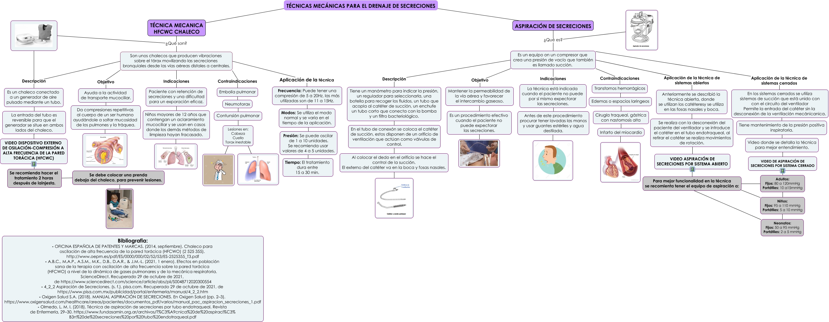 Este Cmap, tiene información relacionada con: TECNICAS MECANICAS PARA EL DRENAJE DE SECRECIONES2, Modos: Se utiliza el modo normal y se varia en el tiempo de la aplicación. ???? Presión: Se puede oscilar de 1 a 10 unidades. Se recomienda usar valores de 4 a 5 unidades., Presión: Se puede oscilar de 1 a 10 unidades. Se recomienda usar valores de 4 a 5 unidades. ???? Tiempo: El tratamiento dura entre 15 a 30 min., Frecuencia: Puede tener una compresión de 5 a 20Hz, las más utilizadas son de 11 a 15Hz. ???? Modos: Se utiliza el modo normal y se varia en el tiempo de la aplicación., Son unos chalecos que producen vibraciones sobre el tórax movilizando las secreciones bronquiales desde las vías aéreas distales a centrales. Indicaciones Paciente con retención de secreciones y una dificultad para un exporación eficaz., En los sistemas cerrados se utiliza sistemas de succión que está unido con con el circuito del ventilador Permite la entrada del catéter sin la desconexión de la ventilación mecánicanica. ???? Tiene mantenimiento de la presión positiva inspiratoria., Es un equipo on un compresor que crea una presión de vacío que también es llamado succión. Objetivo Mantener la permeabilidad de la vía aérea y favorecer el intercambio gaseoso., Lesiones en: Cabeza Cuello Torax inestable ????, Adultos: Fijos: 80 a 120mmHg Portátiles: 10 a15mmHg ???? Niños: Fijos: 95 a 110 mmHg Portátiles: 5 a 10 mmHg, Niños mayores de 12 años que contengan un aclaramiento mucociliar y se usan en casos donde los demás métodos de limpieza hayan fracasado. ????, Es un equipo on un compresor que crea una presión de vacío que también es llamado succión. Contraindicaciones Transtornos hemorrágicos, Tiene un manómetro para indicar la presión, un regulador para seleccionarla, una botella para recoger los fluidos, un tubo que acopla al catéter de succión, un enchufe un tubo corto que conecta con la bomba y un filtro bacteriológico. ???? En el tubo de conexón se coloca el catéter de succión, estos disponen de un orificio de ventilación que actúan como válvulas de control., Son unos chalecos que producen vibraciones sobre el tórax movilizando las secreciones bronquiales desde las vías aéreas distales a centrales. Objetivo Ayuda a la actividad de transporte mucociliar., Se realiza con la desconexión del paciente del ventilador y se introduce el catéter en el tubo endotraqueal, al retirar el catéter se realiza movimientos de rotación. ???? VIDEO ASPIRACIÓN DE SECRECIONES POR SISTEMA ABIERTO, Tiene mantenimiento de la presión positiva inspiratoria. ???? Video donde se detalla la técnica para mejor entendimiento., Son unos chalecos que producen vibraciones sobre el tórax movilizando las secreciones bronquiales desde las vías aéreas distales a centrales. Aplicación de la técnica Frecuencia: Puede tener una compresión de 5 a 20Hz, las más utilizadas son de 11 a 15Hz., Se debe colocar una prenda debajo del chaleco, para prevenir lesiones. ????, ¿Qué es? Es un equipo on un compresor que crea una presión de vacío que también es llamado succión., Se debe colocar una prenda debajo del chaleco, para prevenir lesiones. ???? Se recomienda hacer el tratamiento 2 horas después de lainjesta., Cirugía traqueal, gástrica con nastomosis alta ???? Infarto del miocardio, Neonatos: Fijos: 50 a 95 mmHg Portátiles: 2 a 5 mmHg ???? Para mejor funcionalidad en la técnica se recomienta tener el equipo de aspiración a: