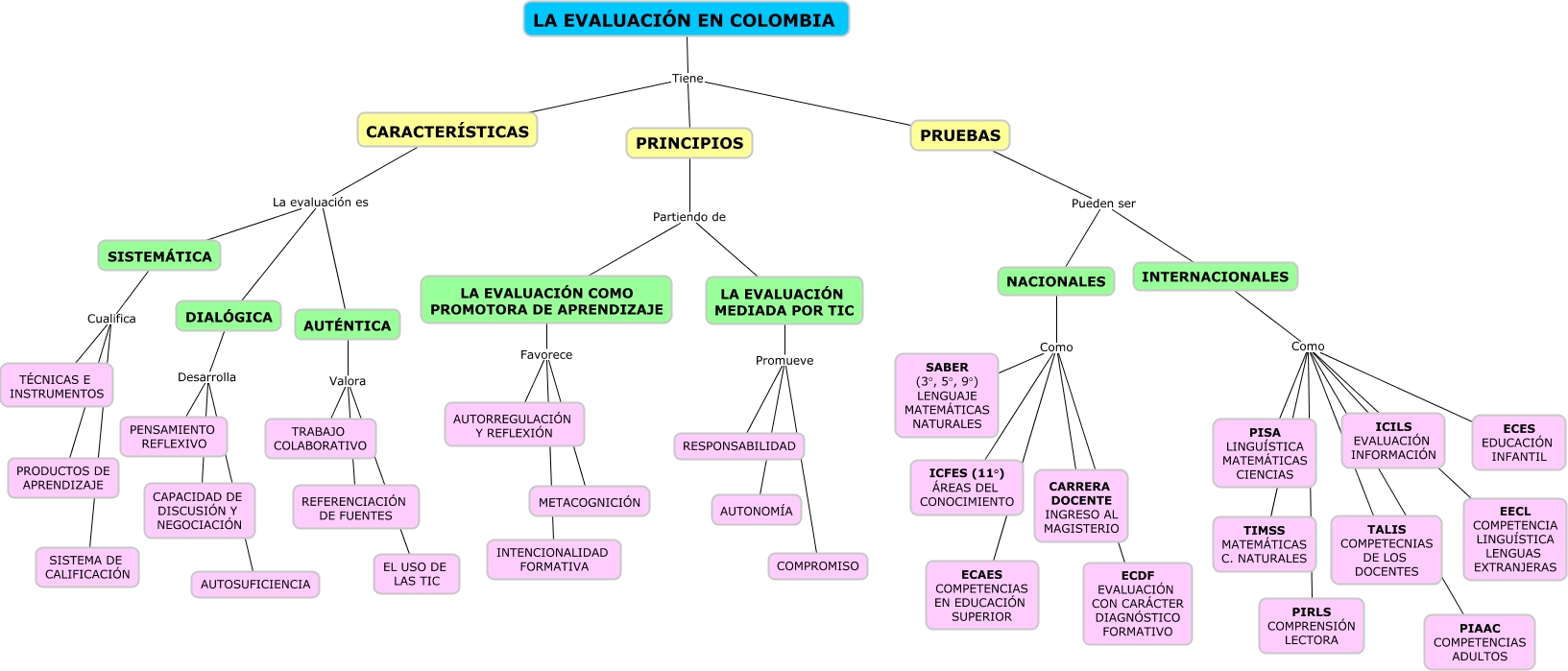 Este Cmap, tiene información relacionada con: LA EVALUACIÓN EN COLOMBIA, NACIONALES Como CARRERA DOCENTE INGRESO AL MAGISTERIO, LA EVALUACIÓN MEDIADA POR TIC Promueve AUTONOMÍA, INTERNACIONALES Como TALIS COMPETECNIAS DE LOS DOCENTES, LA EVALUACIÓN COMO PROMOTORA DE APRENDIZAJE Favorece AUTORREGULACIÓN Y REFLEXIÓN, AUTÉNTICA Valora EL USO DE LAS TIC, SISTEMÁTICA Cualifica TÉCNICAS E INSTRUMENTOS, INTERNACIONALES Como PISA LINGUÍSTICA MATEMÁTICAS CIENCIAS, PRUEBAS Pueden ser INTERNACIONALES, DIALÓGICA Desarrolla AUTOSUFICIENCIA, DIALÓGICA Desarrolla CAPACIDAD DE DISCUSIÓN Y NEGOCIACIÓN, INTERNACIONALES Como PIAAC COMPETENCIAS ADULTOS, NACIONALES Como ECDF EVALUACIÓN CON CARÁCTER DIAGNÓSTICO FORMATIVO, LA EVALUACIÓN COMO PROMOTORA DE APRENDIZAJE Favorece METACOGNICIÓN, AUTÉNTICA Valora TRABAJO COLABORATIVO, INTERNACIONALES Como TIMSS MATEMÁTICAS C. NATURALES, AUTÉNTICA Valora REFERENCIACIÓN DE FUENTES, DIALÓGICA Desarrolla PENSAMIENTO REFLEXIVO, CARACTERÍSTICAS La evaluación es SISTEMÁTICA, CARACTERÍSTICAS La evaluación es AUTÉNTICA, SISTEMÁTICA Cualifica SISTEMA DE CALIFICACIÓN