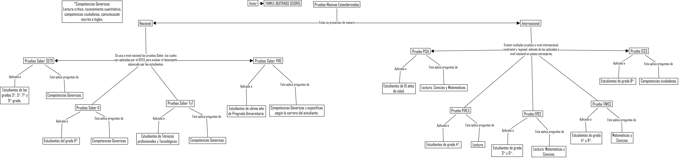 Este Cmap, tiene información relacionada con: Pruebas Masivas Estandarizadas, Autor ???? YAMILE BUITRAGO OSORIO, Prueba ICCS Esta aplica preguntas de Competencias ciudadanas., Pruebas Saber 11 Esta aplica preguntas de Competencias Genericas., Prueba PIRLS Esta aplica preguntas de Lectura., Pruebas Saber 3579 Aplicada a Estudiantes de los grados 3°, 5°, 7° y 9° grado., Prueba TIMSS Esta aplica preguntas de Matematicas y Ciencias, Prueba ICCS Aplicada a Estudiantes de grado 8°., Internacional Ecisten multiples pruebas a nivel internacional, continetal y regional, además de las aplicadas a nivel nacional en paises extranjeros. Prueba ICCS, Prueba PISA Esta aplica preguntas de Lectura, Ciencias y Matematicas., Prueba ERCE Aplicada a Estudiantes de grado 3° y 6°., Pruebas Saber 3579 Esta aplica preguntas de Competencias Genericas., Nacional Se usa a nivel nacional las pruebas Saber, las cuales son aplicadas por el ICFES para evaluar el desempeño alcanzado por los estudiantes. Pruebas Saber PRO, Pruebas Masivas Estandarizadas Estas se presentan de manera Internacional, Internacional Ecisten multiples pruebas a nivel internacional, continetal y regional, además de las aplicadas a nivel nacional en paises extranjeros. Prueba TIMSS, Prueba PIRLS Aplicada a Estudiantes de grado 4°., Internacional Ecisten multiples pruebas a nivel internacional, continetal y regional, además de las aplicadas a nivel nacional en paises extranjeros. Prueba PISA, Internacional Ecisten multiples pruebas a nivel internacional, continetal y regional, además de las aplicadas a nivel nacional en paises extranjeros. Prueba PIRLS, Internacional Ecisten multiples pruebas a nivel internacional, continetal y regional, además de las aplicadas a nivel nacional en paises extranjeros. Prueba ERCE, Nacional Se usa a nivel nacional las pruebas Saber, las cuales son aplicadas por el ICFES para evaluar el desempeño alcanzado por los estudiantes. Pruebas Saber 3579, Prueba PISA Aplicada a Estudiantes de 15 años de edad.
