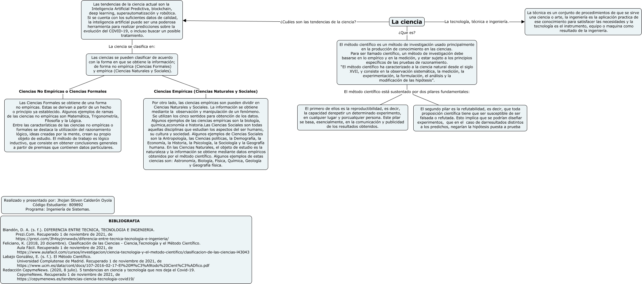 Este Cmap, tiene información relacionada con: La Ciencia, Las ciencias se pueden clasificar de acuerdo con la forma en que se obtiene la información; de forma no empírica (Ciencias Formales) y empírica (Ciencias Naturales y Sociales). Ciencias Empíricas (Ciencias Naturales y Sociales) Por otro lado, las ciencias empíricas son pueden dividir en Ciencias Naturales y Sociales. La información se obtiene mediante la observación y manipulación de un fenómeno. Se utilizan los cinco sentidos para obtención de los datos. Algunos ejemplos de las ciencias empíricas son la biología, química,economía e historia.Las Ciencias Sociales son todas aquellas disciplinas que estudian los aspectos del ser humano, su cultura y sociedad. Algunos ejemplos de Ciencias Sociales son la Antropología, las Ciencias políticas, la Demografía, la Economía, la Historia, la Psicología, la Sociología y la Geografía humana. En las Ciencias Naturales, el objeto de estudio es la naturaleza y la información se obtiene mediante datos empíricos obtenidos por el método científico. Algunos ejemplos de estas ciencias son: Astronomía, Biología, Física, Química, Geología y Geografía física., La ciencia ¿Cuáles son las tendencias de la ciencia? Las tendencias de la ciencia actual son la Inteligencia Artificial Predictiva, blockchain, deep learning, superautomatización y robótica. Si se cuenta con los suficientes datos de calidad, la inteligencia artificial puede ser una poderosa herramienta para realizar predicciones sobre la evolución del COVID-19, o incluso buscar un posible tratamiento., La ciencia ¿Que es? El método científico es un método de investigación usado principalmente en la producción de conocimiento en las ciencias. Para ser llamado científico, un método de investigación debe basarse en lo empírico y en la medición, y estar sujeto a los principios específicos de las pruebas de razonamiento. “El método científico ha caracterizado a la ciencia natural desde el siglo XVII, y consiste en la observación sistemática, la medición, la experimentación, la formulación, el análisis y la modificación de las hipótesis”., El método científico es un método de investigación usado principalmente en la producción de conocimiento en las ciencias. Para ser llamado científico, un método de investigación debe basarse en lo empírico y en la medición, y estar sujeto a los principios específicos de las pruebas de razonamiento. “El método científico ha caracterizado a la ciencia natural desde el siglo XVII, y consiste en la observación sistemática, la medición, la experimentación, la formulación, el análisis y la modificación de las hipótesis”. El método científico está sustentado por dos pilares fundamentales: El segundo pilar es la refutabilidad, es decir, que toda proposición científica tiene que ser susceptible de ser falsada o refutada. Esto implica que se podrían diseñar experimentos, que en el caso de darresultados distintos a los predichos, negarían la hipótesis puesta a prueba, El método científico es un método de investigación usado principalmente en la producción de conocimiento en las ciencias. Para ser llamado científico, un método de investigación debe basarse en lo empírico y en la medición, y estar sujeto a los principios específicos de las pruebas de razonamiento. “El método científico ha caracterizado a la ciencia natural desde el siglo XVII, y consiste en la observación sistemática, la medición, la experimentación, la formulación, el análisis y la modificación de las hipótesis”. El método científico está sustentado por dos pilares fundamentales: El primero de ellos es la reproductibilidad, es decir, la capacidad derepetir un determinado experimento, en cualquier lugar y porcualquier persona. Este pilar se basa, esencialmente, en la comunicación y publicidad de los resultados obtenidos., La ciencia La tecnología, técnica e ingeniería. La técnica es un conjunto de procedimientos de que se sirve una ciencia o arte, la ingeniería es la aplicación practica de ese conocimiento para satisfacer las necesidades y la tecnología es el instrumento, equipo o maquina como resultado de la ingeniería., Las ciencias se pueden clasificar de acuerdo con la forma en que se obtiene la información; de forma no empírica (Ciencias Formales) y empírica (Ciencias Naturales y Sociales). Ciencias No Empíricas o Ciencias Formales Las Ciencias Formales se obtiene de una forma no empíricas. Estas se derivan a partir de un hecho o principio ya establecido. Algunos ejemplos de ramas de las ciencias no empíricas son Matemática, Trigonometría, Filosofía y la Lógica. Entre las características de las ciencias no empíricas o formales se destaca la utilización del razonamiento lógico, ideas creadas por la mente, crean su propio objeto de estudio. El método de trabajo es lógico inductivo, que consiste en obtener conclusiones generales a partir de premisas que contienen datos particulares., Las tendencias de la ciencia actual son la Inteligencia Artificial Predictiva, blockchain, deep learning, superautomatización y robótica. Si se cuenta con los suficientes datos de calidad, la inteligencia artificial puede ser una poderosa herramienta para realizar predicciones sobre la evolución del COVID-19, o incluso buscar un posible tratamiento. La ciencia se clasifica en: Las ciencias se pueden clasificar de acuerdo con la forma en que se obtiene la información; de forma no empírica (Ciencias Formales) y empírica (Ciencias Naturales y Sociales).