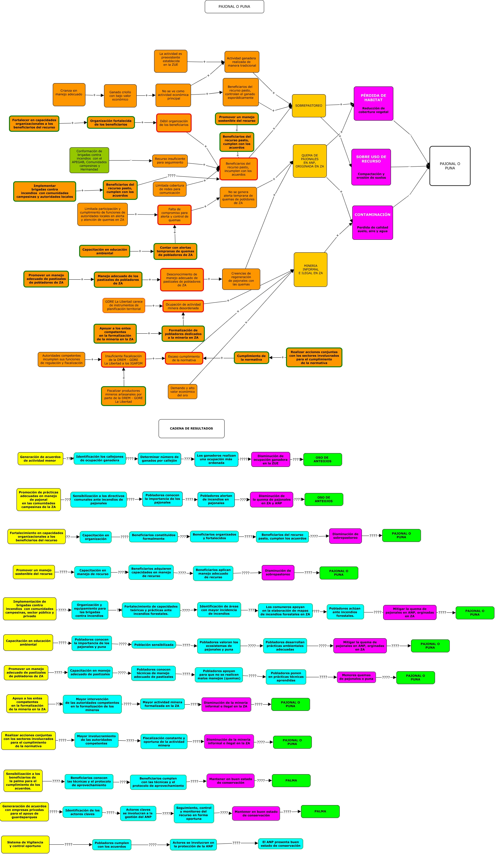 Este Cmap, tiene información relacionada con: PAJONAL O PUNA_ESTRATEGIA_COPIA 03.11_1pm, Beneficiarios del recurso pasto, cumplen con los acuerdos ???? Beneficiarios del recurso pasto, incumplen con los acuerdos, Beneficiarios cumplen con las técnicas y el protocolo de aprovechamiento ???? Mantener en buen estado de conservación, Recurso insuficiente para seguimiento + Beneficiarios del recurso pasto, incumplen con los acuerdos, Insuficiente fiscalización de la DREM - GORE La Libertad a los IGAFOM + Escaso cumplimiento de la normativa, Fiscalización constante y oportuna de la actividad minera ???? Disminución de la minería informal e ilegal en la ZA, Ganado criollo con bajo valor económico + No se ve como actividad económica principal, Promover un manejo adecuado de pastizales de pobladores de ZA + Manejo adecuado de los pastizales de pobladores de ZA, Autoridades competentes incumplen sus funciones de regulación y fiscalización + Insuficiente fiscalización de la DREM - GORE La Libertad a los IGAFOM, Promover un manejo sostenible del recurso + Beneficiarios del recurso pasto, cumplen con los acuerdos, CONTAMINACIÓN Perdida de calidad suelo, aire y agua - PAJONAL O PUNA, Implementación de brigadas contra incendios con comunidades campesinas, sector público y privado ???? Organización y equipamiento para las brigadas contra incendios, QUEMA DE PAJONALES EN ANP, ORIGINADA EN ZA + PÉRDIDA DE HABITAT Reducción de cobertura vegetal, Fiscalizar productores mineros artesanales por parte de la DREM - GORE La Libertad + Insuficiente fiscalización de la DREM - GORE La Libertad a los IGAFOM, Promover un manejo adecuado de pastizales de pobladores de ZA ???? Capacitación en manejo adecuado de pastizales, Falta de compromiso para alerta y control de quemas + No se genera alerta temprana de quemas de pobldores de ZA, Beneficiarios conocen las técnicas y el protocolo de aprovechamiento ???? Beneficiarios cumplen con las técnicas y el protocolo de aprovechamiento, No se ve como actividad económica principal + Beneficiarios del recurso pasto, controlan el ganado esporádicamente, Disminución de sobrepastoreo ???? PAJONAL O PUNA, Identificación de áreas con mayor incidencia de incendios ???? Los comuneros apoyan en la elaboración de mapas de incendios forestales en ZA, Beneficiarios del recurso pasto, cumplen con los acuerdos + Beneficiarios del recurso pasto, incumplen con los acuerdos