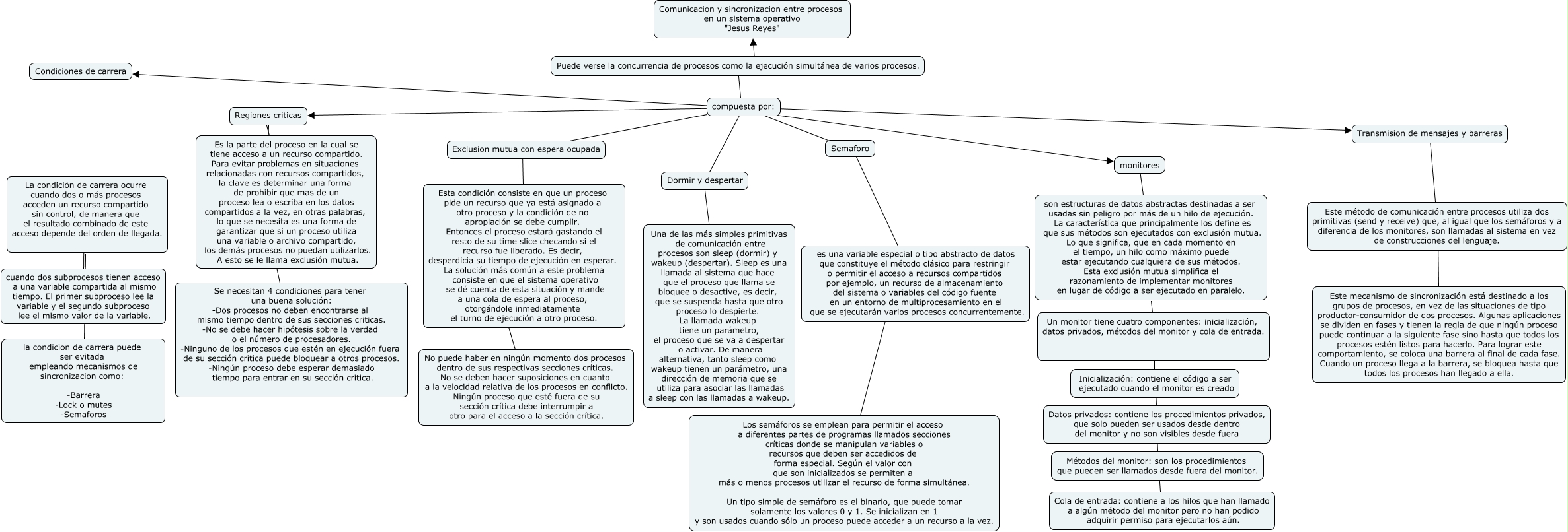 Este Cmap, tiene información relacionada con: c y s entre procesos, compuesta por: ???? Exclusion mutua con espera ocupada, es una variable especial o tipo abstracto de datos que constituye el método clásico para restringir o permitir el acceso a recursos compartidos por ejemplo, un recurso de almacenamiento del sistema o variables del código fuente en un entorno de multiprocesamiento en el que se ejecutarán varios procesos concurrentemente. ???? Los semáforos se emplean para permitir el acceso a diferentes partes de programas llamados secciones críticas donde se manipulan variables o recursos que deben ser accedidos de forma especial. Según el valor con que son inicializados se permiten a más o menos procesos utilizar el recurso de forma simultánea. Un tipo simple de semáforo es el binario, que puede tomar solamente los valores 0 y 1. Se inicializan en 1 y son usados cuando sólo un proceso puede acceder a un recurso a la vez., compuesta por: ???? Condiciones de carrera, Semaforo ???? es una variable especial o tipo abstracto de datos que constituye el método clásico para restringir o permitir el acceso a recursos compartidos por ejemplo, un recurso de almacenamiento del sistema o variables del código fuente en un entorno de multiprocesamiento en el que se ejecutarán varios procesos concurrentemente., son estructuras de datos abstractas destinadas a ser usadas sin peligro por más de un hilo de ejecución. La característica que principalmente los define es que sus métodos son ejecutados con exclusión mutua. Lo que significa, que en cada momento en el tiempo, un hilo como máximo puede estar ejecutando cualquiera de sus métodos. Esta exclusión mutua simplifica el razonamiento de implementar monitores en lugar de código a ser ejecutado en paralelo. ???? Un monitor tiene cuatro componentes: inicialización, datos privados, métodos del monitor y cola de entrada., Inicialización: contiene el código a ser ejecutado cuando el monitor es creado ???? Datos privados: contiene los procedimientos privados, que solo pueden ser usados desde dentro del monitor y no son visibles desde fuera, Puede verse la concurrencia de procesos como la ejecución simultánea de varios procesos. ???? Comunicacion y sincronizacion entre procesos en un sistema operativo "Jesus Reyes", Regiones criticas ???? Es la parte del proceso en la cual se tiene acceso a un recurso compartido. Para evitar problemas en situaciones relacionadas con recursos compartidos, la clave es determinar una forma de prohibir que mas de un proceso lea o escriba en los datos compartidos a la vez, en otras palabras, lo que se necesita es una forma de garantizar que si un proceso utiliza una variable o archivo compartido, los demás procesos no puedan utilizarlos. A esto se le llama exclusión mutua., Un monitor tiene cuatro componentes: inicialización, datos privados, métodos del monitor y cola de entrada. ???? Inicialización: contiene el código a ser ejecutado cuando el monitor es creado, compuesta por: ???? monitores, Condiciones de carrera ???? La condición de carrera ocurre cuando dos o más procesos acceden un recurso compartido sin control, de manera que el resultado combinado de este acceso depende del orden de llegada., Métodos del monitor: son los procedimientos que pueden ser llamados desde fuera del monitor. ???? Cola de entrada: contiene a los hilos que han llamado a algún método del monitor pero no han podido adquirir permiso para ejecutarlos aún., Puede verse la concurrencia de procesos como la ejecución simultánea de varios procesos. ???? compuesta por:, Exclusion mutua con espera ocupada ???? Esta condición consiste en que un proceso pide un recurso que ya está asignado a otro proceso y la condición de no apropiación se debe cumplir. Entonces el proceso estará gastando el resto de su time slice checando si el recurso fue liberado. Es decir, desperdicia su tiempo de ejecución en esperar. La solución más común a este problema consiste en que el sistema operativo se dé cuenta de esta situación y mande a una cola de espera al proceso, otorgándole inmediatamente el turno de ejecución a otro proceso., compuesta por: ???? Dormir y despertar, monitores ???? son estructuras de datos abstractas destinadas a ser usadas sin peligro por más de un hilo de ejecución. La característica que principalmente los define es que sus métodos son ejecutados con exclusión mutua. Lo que significa, que en cada momento en el tiempo, un hilo como máximo puede estar ejecutando cualquiera de sus métodos. Esta exclusión mutua simplifica el razonamiento de implementar monitores en lugar de código a ser ejecutado en paralelo., Regiones criticas ???? Se necesitan 4 condiciones para tener una buena solución: -Dos procesos no deben encontrarse al mismo tiempo dentro de sus secciones criticas. -No se debe hacer hipótesis sobre la verdad o el número de procesadores. -Ninguno de los procesos que estén en ejecución fuera de su sección critica puede bloquear a otros procesos. -Ningún proceso debe esperar demasiado tiempo para entrar en su sección critica., compuesta por: ???? Regiones criticas, Esta condición consiste en que un proceso pide un recurso que ya está asignado a otro proceso y la condición de no apropiación se debe cumplir. Entonces el proceso estará gastando el resto de su time slice checando si el recurso fue liberado. Es decir, desperdicia su tiempo de ejecución en esperar. La solución más común a este problema consiste en que el sistema operativo se dé cuenta de esta situación y mande a una cola de espera al proceso, otorgándole inmediatamente el turno de ejecución a otro proceso. ???? No puede haber en ningún momento dos procesos dentro de sus respectivas secciones críticas. No se deben hacer suposiciones en cuanto a la velocidad relativa de los procesos en conflicto. Ningún proceso que esté fuera de su sección crítica debe interrumpir a otro para el acceso a la sección cr