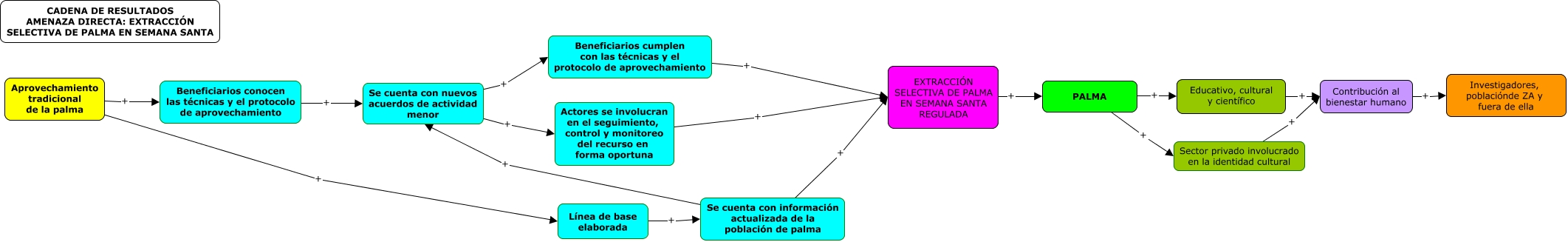 Este Cmap, tiene información relacionada con: CADENA DE RESULTADOS_EXTRACCION SELECTIVA EN SEMANA SANTA, PALMA + Educativo, cultural y científico, Beneficiarios cumplen con las técnicas y el protocolo de aprovechamiento + EXTRACCIÓN SELECTIVA DE PALMA EN SEMANA SANTA REGULADA, EXTRACCIÓN SELECTIVA DE PALMA EN SEMANA SANTA REGULADA + PALMA, Se cuenta con información actualizada de la población de palma + EXTRACCIÓN SELECTIVA DE PALMA EN SEMANA SANTA REGULADA, Se cuenta con nuevos acuerdos de actividad menor + Actores se involucran en el seguimiento, control y monitoreo del recurso en forma oportuna, Se cuenta con nuevos acuerdos de actividad menor + Beneficiarios cumplen con las técnicas y el protocolo de aprovechamiento, Se cuenta con información actualizada de la población de palma + Se cuenta con nuevos acuerdos de actividad menor, PALMA + Sector privado involucrado en la identidad cultural, Educativo, cultural y científico + Contribución al bienestar humano, Beneficiarios conocen las técnicas y el protocolo de aprovechamiento + Se cuenta con nuevos acuerdos de actividad menor, Contribución al bienestar humano + Investigadores, poblaciónde ZA y fuera de ella, Sector privado involucrado en la identidad cultural + Contribución al bienestar humano, Aprovechamiento tradicional de la palma + Beneficiarios conocen las técnicas y el protocolo de aprovechamiento, Línea de base elaborada + Se cuenta con información actualizada de la población de palma, Actores se involucran en el seguimiento, control y monitoreo del recurso en forma oportuna + EXTRACCIÓN SELECTIVA DE PALMA EN SEMANA SANTA REGULADA, Aprovechamiento tradicional de la palma + Línea de base elaborada